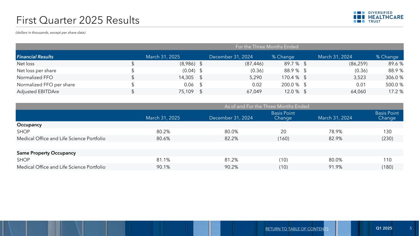 2025年第一季度4财务业绩2025年第一季度亮点回归目录运营更新流动性、融资和投资活动•净亏损900万美元,合每股0.04美元。•正常化FFO为1430万美元,合每股0.06美元。•第一季度SHOP入住率同比增长130个基点至80.2%,平均月费率增长4.8%,导致SHOP收入增长6.5%。•综合SHOP NOI同比增长49.0%至3680万美元,其中利润率增长320个基点。•租赁了144,708平方英尺的医疗办公室和生命科学投资组合,加权平均租金比之前相同空间的租金高出18.4%。• 2025年3月,DHC执行了一笔1.40亿美元的抵押贷款,由14个老年生活社区提供担保。•大约3.067亿美元的现金和现金等价物以及限制性现金。2025年4月,DHC使用这笔现金中的1.40亿美元部分赎回了其当时未偿还的3.80亿美元、将于2025年6月到期的高级无担保票据。• 2025年4月,DHC执行了一笔由七个高级生活社区担保的额外抵押贷款,收益为1.089亿美元,并向2025年6月到期的高级无抵押票据的持有人发出通知,要求他们在2025年5月使用这些收益加上手头现金赎回额外的1.40亿美元。•截至2025年5月2日,DHC已与额外的贷方执行了条款清单,预计总收益为9400万美元,用于由总共六个高级生活社区担保的贷款。DHC打算将这些收益和手头现金用于赎回2025年6月到期的剩余未偿还的1.00亿美元高级无担保票据。• 2025年第一季度,DHC出售了22处为其2026年到期的优先担保票据提供担保的房产,总销售价格为3.011亿美元,不包括交割费用,并使用这些出售所得的总净收益2.992亿美元部分赎回这些优先担保票据。DHC还在2025年第一季度出售了两处未设押物业,总销售价格为1970万美元,不包括交割成本。•截至2025年5月2日,DHC根据协议或意向书以1.027亿美元的价格出售17处未设押财产和以1310万美元的价格出售两处设押财产,不包括结算费用。截至三个月的相同财产现金基础NOI(单位:千美元)2025年3月31日2024年12月31日%变化2024年3月31日%变化SHOP 38,368美元28,72933.6% 26,99842.1%医疗办公室和生命科学投资组合26,29125,8571.7% 26,683(1.5)%所有其他6,8877,746(11.1)% 5,59923.0%合并71,546美元62,33214.8% 59,28020.7%截至2025年3月31日止三个月,除非另有说明