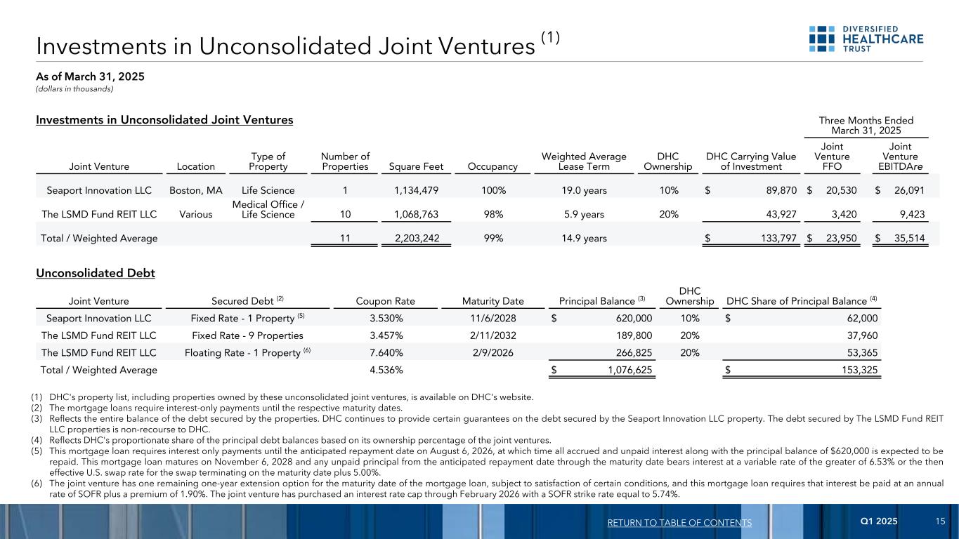 2025年第一季度15对未合并合资企业的投资(1)(单位:千美元)截至2025年3月31日的目录回报截至2025年3月31日的三个月合资企业位置类型物业数量平方英尺占用面积加权平均租赁期限DHC所有权DHC投资的账面价值合资企业FFO合资企业EBITDA Are Seaport Innovation LLC波士顿,MA Life Science 11,134,479100% 19.0年10% $ 89,870 $ 20,530 $ 26,091 The LSMD Fund REIT LLC Various Medical Office/Life Science 101,068,76398% 5.9年20% 43,9273,4209,423总计/加权平均112,203,24299% 14.9年$ 133,797 $ 23,950 $ 35,514投资于未合并的合资企业未合并债务合资企业有担保债务(2)票面利率到期日本金余额(3)DHC所有权丨DHC丨占本金余额的份额(4)Seaport Innovation LLC固定利率-1处房产(5)3.530% 11/6/2028 $ 620,00010% $ 62,000 The LSMD Fund REIT LLC Fixed Rate-9 Properties 3.457% 2/11/2032189,80020% 37,960 The LSMD Fund REIT LLC Floating Rate-1 Properties(6)7.640% 2/9/2026266,82520% 53,365 Total/Weighted Average 4.536% $ 1,076,625 $ 153,325(1)DHC的财产清单,包括这些未合并的合资企业拥有的财产,可在DHC的网站上查阅。(2)按揭贷款要求只付利息,直至相应的到期日。(3)反映物业担保债务的全部余额。DHC继续为Seaport Innovation LLC财产担保的债务提供一定的担保。由LSMD Fund REIT LLC财产担保的债务对DHC无追索权。(4)反映DHC根据其在合营企业中的所有权百分比在主债务余额中所占的比例。(5)这笔抵押贷款只需要支付利息,直到2026年8月6日的预期还款日期,届时所有应计和未支付的利息以及本金余额620,000美元预计将得到偿还。这笔抵押贷款于2028年11月6日到期,从预期还款日到到期日的任何未付本金按6.53%或在到期日终止的掉期的当时有效美国掉期利率加5.00%中的较大者的浮动利率计息。(6)合营企业对抵押贷款的到期日有一个剩余的一年展期选择权,但须满足某些条件,并且此抵押贷款要求按SOFR的年利率加上1.90%的溢价支付利息。这家合资企业购买了截至2026年2月的利率上限,SOFR执行率等于5.74%。