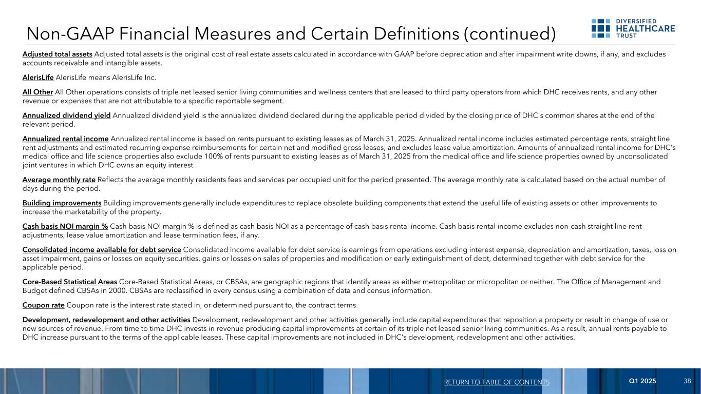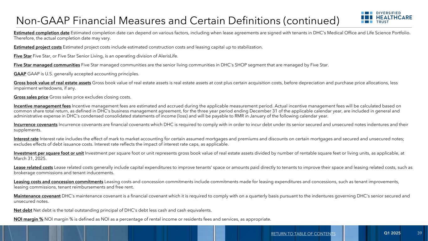 2025年第一季度38调整后总资产调整后总资产是按照公认会计原则在折旧前和减值减记(如果有的话)后计算的房地产资产的原始成本,不包括应收账款和无形资产。AlerisLifeAlerisLife是指AlerisLife Inc。所有其他所有其他业务包括三重净租赁的老年生活社区和健康中心,这些社区和健康中心出租给第三方运营商,DHC从中收取租金,以及任何其他不可归属于特定报告分部的收入或费用。年化股息收益率年化股息收益率是在适用期间内宣布的年化股息除以相关期间末DHC普通股的收盘价。年化租金收入年化租金收入基于截至2025年3月31日的现有租约的租金。年化租金收入包括估计百分比租金、直线租金调整以及某些净租赁和修改后总租赁的估计经常性费用偿还,不包括租赁价值摊销。DHC的医疗办公室和生命科学物业的年化租金收入金额也不包括根据截至2025年3月31日的现有租约从未合并的合资企业拥有的医疗办公室和生命科学物业中获得的100%租金,而DHC拥有股权。平均月费率反映所列期间每个被占用单位的平均每月居民费用和服务。平均月费率是根据期间的实际天数计算得出的。建筑改进建筑改进一般包括用于更换延长现有资产使用寿命的过时建筑部件的支出或用于增加物业适销性的其他改进。现金基础NOI保证金%现金基础NOI保证金%定义为现金基础NOI占现金基础租金收入的百分比。现金制租金收入不包括非现金直线租金调整、租赁价值摊销和租赁终止费(如有)。可用于还本付息的合并收入可用于还本付息的合并收入是经营收益,不包括利息费用、折旧和摊销、税收、资产减值损失、股本证券损益、出售财产和债务变更或提前清偿的损益,与适用期间的还本付息一起确定。基于核心的统计区域基于核心的统计区域,或CBSA,是将区域确定为大都市或小城市或两者都不是的地理区域。管理和预算办公室在2000年定义了CBSA。CBSA在每次普查中使用数据和普查信息的组合进行重新分类。票面利率票面利率是指在合同条款中载明或根据合同条款确定的利率。开发、再开发和其他活动开发、再开发和其他活动一般包括重新定位财产或导致改变用途或新的收入来源的资本支出。DHC不时对其某些三重净租赁的老年生活社区进行创收资本改善投资。因此,根据适用租约的条款,应付给DHC的年租金增加。这些基本建设改进不包括在DHC的开发、再开发和其他活动中。非GAAP财务指标和某些定义(续)返回目录