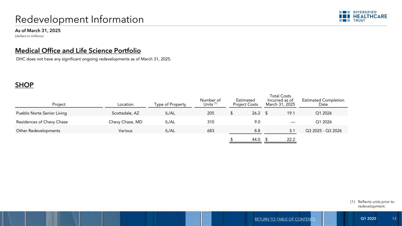 2025年第一季度13 DHC并无任何截至2025年3月31日正在进行的重大重建。(1)反映重建前的单位。重建信息(百万美元)返回目录截至2025年3月31日的医疗办公室和生命科学投资组合项目位置物业类型单元数量(1)估计项目成本截至2025年3月31日发生的总成本预计完成日期Pueblo Norte Senior Living Scottsdale,AZ IL/AL 205 $ 26.2 $ 19.1 Q1 2026 Chevy Chase Chevy Chase,MD IL/AL 3109.0 — Q1 2026其他重建各种IL/AL 6838.8 3.1 Q3 2025-Q3 2026 $ 44.0 $ 22.2商店