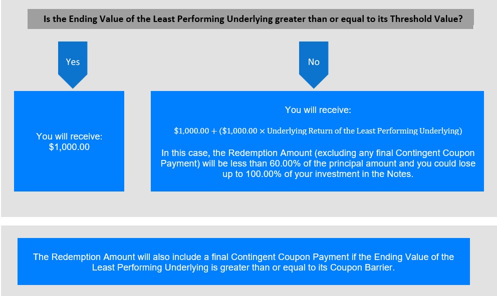 在这种情况下,赎回金额(不包括任何最终或有息票支付)将低于本金额的60.00%,您可能会损失高达100.00%的票据投资。