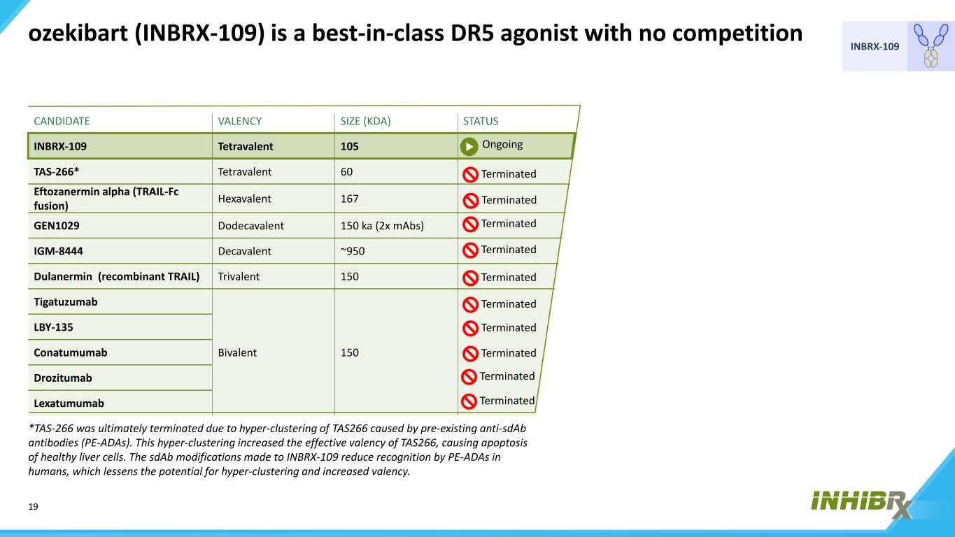 19 INBRX-109 ozekibart(INBRX-109)是一款同类最佳的DR5激动剂,无竞争候选药价大小(KDA)状态INBRX-109四价105 TAS-266*四价60 Eftozanermin α(TRAIL-FC融合)六价167 GEN1029十二价150ka(2x MABs)IGM-8444十价~950杜兰尔明(重组TRAIL)三价150替加妥珠单抗二价150 LBY-135康妥单抗Drozitumab Lexatumumab进行中终止终止终止终止终止终止终止终止终止终止终止终止终止终止终止终止终止终止终止终止终止终止终止终止终止终止终止终止终止终止终止终止终止终止终止终止终止终止终止终止终止终止终止终止终止终止终止终止终止终止终止终止终止终止终止终止终止终止终止终止终止终止终止终止终止终止终止终止终止终止终止终止终止终止终止终止终止终止终止终止终止终止终止终止终止终止终止终止终止终止终止终止终止终止终止终止终止终止终止终止终止终止终止终止终止终止*TAS-266最终被终止,原因是预先存在的抗SDAB抗体(PE-ADAs)导致的TAS266超聚集。这种超聚集增加了TAS266的有效价,导致健康肝细胞凋亡。对INBRX-109所做的sDAB修饰降低了PE-ADAs在人类中的识别,从而降低了超集群和增加化合价的可能性。