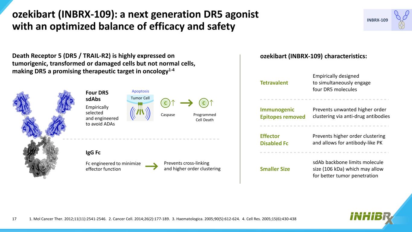 16 INBRX-109 ozekibart(INBRX-109)是一种通过DR5通路导致外在细胞死亡的有效诱导剂Ozekibart(INBRX-109)是一种四价DR5激动剂,旨在同时接合四个DR5分子以驱动肿瘤细胞中增强的聚集/信号传导,同时最大限度地减少脱靶效应凋亡肿瘤细胞DR5 TRAIL FADD Caspase激活中度强凋亡肿瘤细胞ozekibart(INBRX-109)DR5 FADD Caspase激活DR5(TRAIL-R2)是一种TRAIL的促凋亡受体,广泛表达于受损、转化或肿瘤细胞表面,但在正常细胞上很少且水平较低。1-4 TRAIL通过激活FADD和下游caspase通路选择性诱导程序性细胞死亡,因此在肿瘤和病毒免疫监测中发挥重要作用5凋亡肿瘤细胞DR5 FADD caspase激活而DR5三聚体是TRAIL活性的最小功能单位,在细胞-细胞界面结果聚集多个受体可产生更有效的凋亡活性6-8 1。Mol Cancer Ther。2012;11(11):2541-2546.2.癌细胞。2014;26(2):177-189.3.血液学。2005;90(5):612-624.4.Cell Res.2005;15(6):430-438。5.抗体(巴塞尔)。2017;6(4) 6.J Biol化学。2012;287(25):21265-21278.7.细胞。2019;176(6):1477-1489.e1414。8.Proc Natl Acad Sci US SA. 2015;112(18):5679-5684。