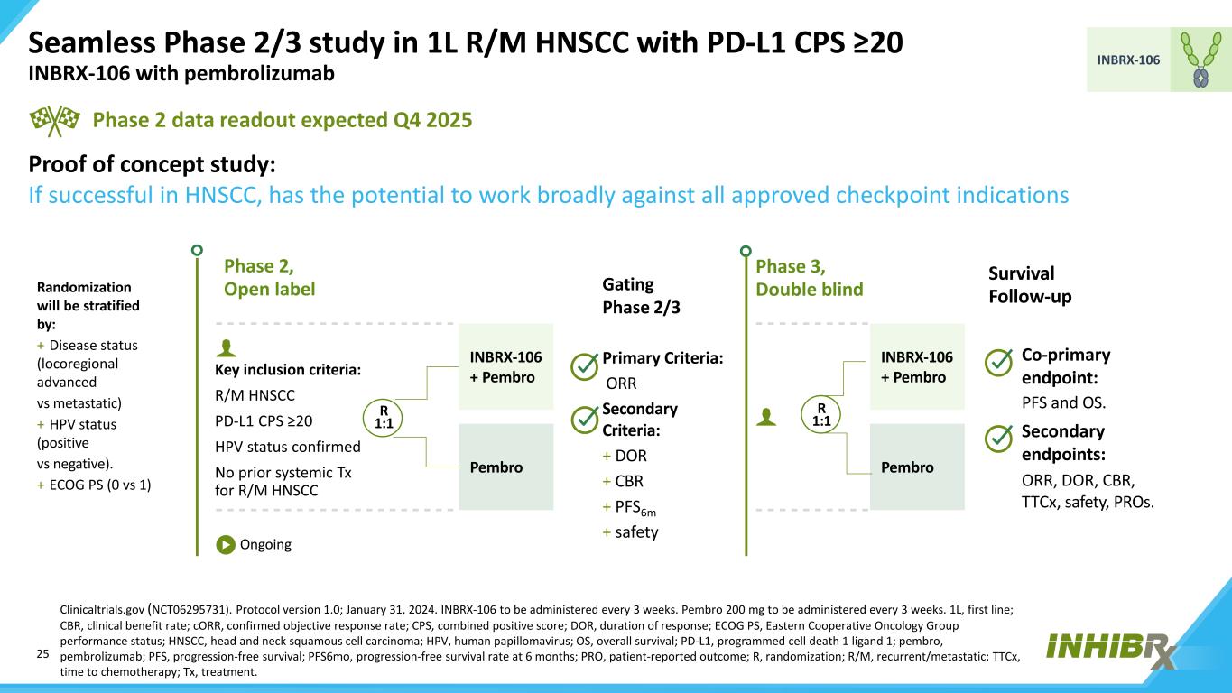 25 INBRX-106与pembrolizumab Clinicaltrials.gov(NCT06295731)在1L R/m HNSCC伴PD-L1 CPS ≥ 20 INBRX-106中的无缝2/3期研究。协议1.0版本;2024年1月31日。INBRX-106每3周给药一次。Pembro 200毫克每3周给药一次。1L,一线;CBR,临床受益率;CORR,确认客观缓解率;CPS,联合阳性评分;DOR,缓解持续时间;ECOG PS,东部合作肿瘤学组表现状态;HNSCC,头颈部鳞状细胞癌;HPV,人乳头瘤病毒;OS,总生存期;PD-L1,程序性细胞死亡1配体1;pembro,pembrolizumab;PFS,无进展生存期;PFS6mo,6个月时无进展生存率;PRO,患者报告的结局;R,随机;R/m,复发/转移;TTCX,化疗时间;TX,治疗。随机化将按以下方式分层:+疾病状态(局部区域晚期vs转移)+ HPV状态(阳性vs阴性)。+ ECOG PS(0 vs 1)2期、开放标签3期、双盲生存随访进行中INBRX-106 + Pembro INBRX-106 + Pembro Pembro共同主要终点:PFS和OS。次要终点:ORR、DOR、CBR、TTCX、安全性、PRO。门控2/3期主要标准:ORR次要标准:+ DOR + CBR + PFS6m +安全性关键纳入标准:R/M HNSCC PD-L1 CPS ≥ 20 HPV状态确认R/M HNSCC R1:1 R1:1的既往系统性TX概念验证研究:如果在HNSCC中成功,有可能针对所有已批准的检查点适应症广泛发挥作用,预计2025年第四季度的2期数据读出