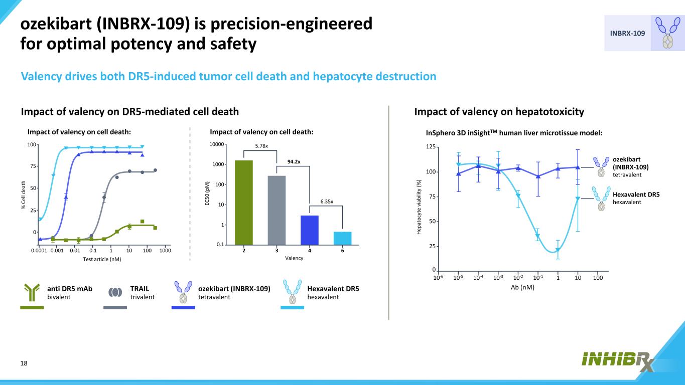 17 INBRX-109 ozekibart(INBRX-109):具有优化的疗效和安全性平衡的下一代DR5激动剂死亡受体5(DR5/TRAIL-R2)在致瘤、转化或受损细胞而非正常细胞上高度表达,使DR5成为肿瘤学中有前途的治疗靶点1-4 ozekibart(INBRX-109)特性:可防止交联和高阶聚集IgG FC FC被设计以最大限度地减少效应功能四个DR5 sDAB经经验选择和工程以避免ADAs肿瘤细胞凋亡Caspase C程序性细胞死亡C四价经经验设计以同时接合四个被移除的DR5分子免疫原性表位可防止通过抗药物抗体产生不必要的高阶聚集,并允许抗体样PK效应器禁用的FC sDAB主干限制分子大小(106 kDa),这可能允许更好的肿瘤穿透更小的尺寸1。Mol Cancer Ther。2012;11(11):2541-2546.2.癌细胞。2014;26(2):177-189.3.血液学。2005;90(5):612-624.4.Cell Res.2005;15(6):430-438