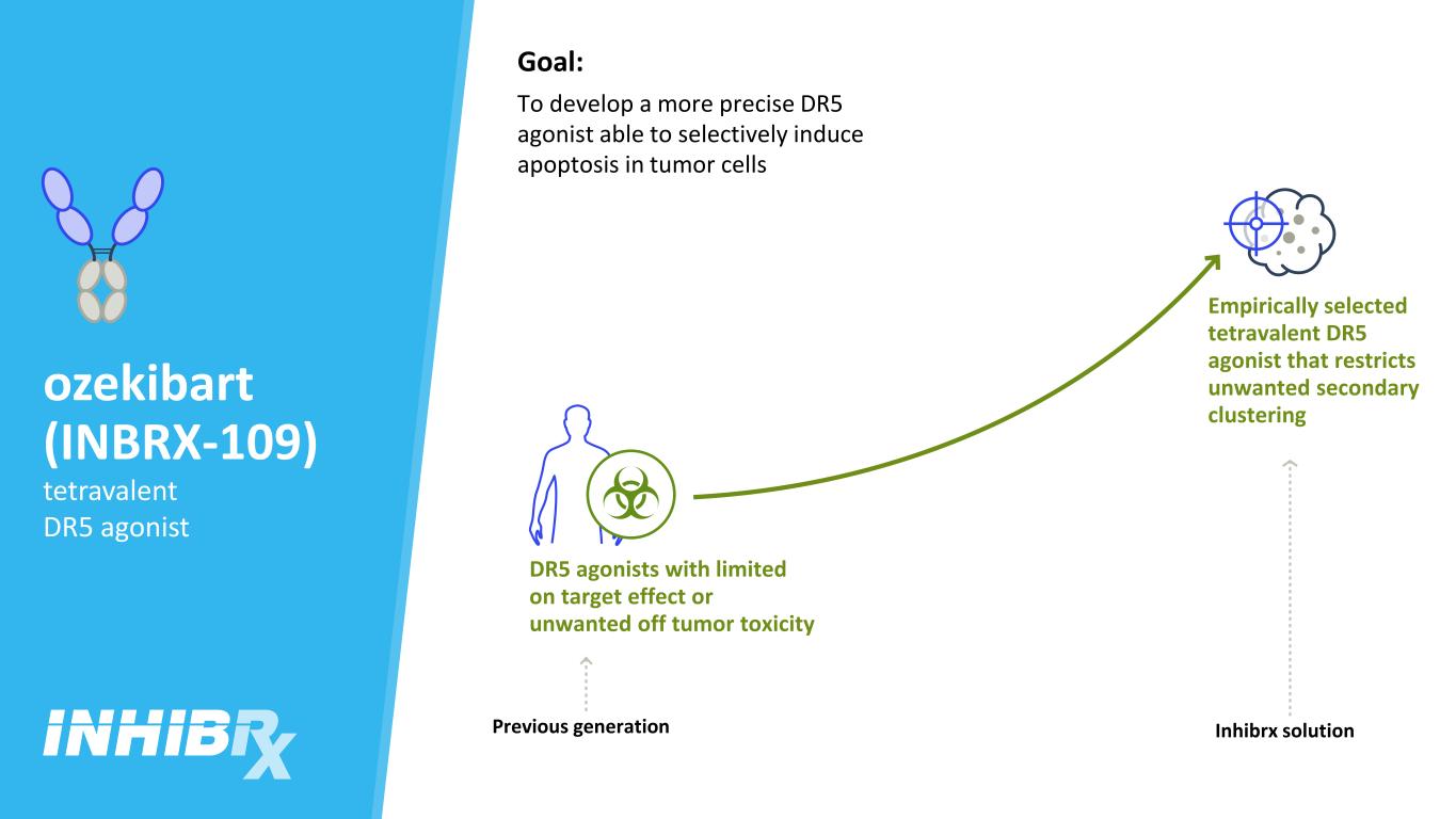 ozekibart(INBRX-109)四价DR5激动剂目标:开发更精确的DR5激动剂,能够选择性地诱导肿瘤细胞凋亡上一代经经验选择的四价DR5激动剂,限制不需要的二次聚类DR5激动剂,靶点效应有限或不需要的脱瘤毒性Inhibrx溶液