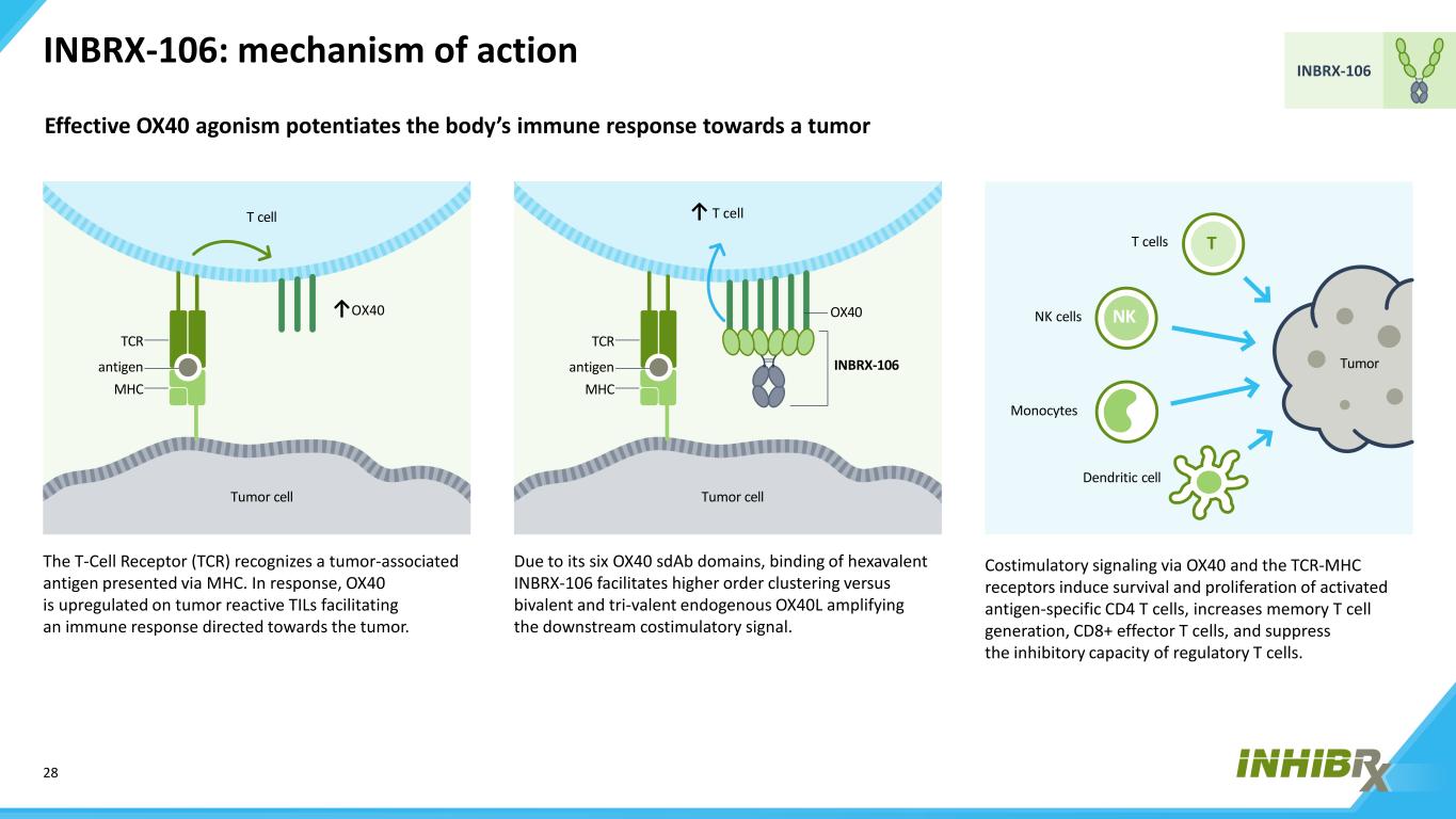 28 INBRX-106 INBRX-106:作用机制T细胞受体(TCR)识别通过MHC呈现的肿瘤相关抗原。作为回应,OX40在肿瘤反应性TILs上被上调,从而促进针对肿瘤的免疫反应。有效的OX40激动剂可增强机体对肿瘤的免疫反应由于其六个OX40 sDAB结构域,与二价和三价内源性OX40L放大下游共刺激信号相比,六价INBRX-106的结合有助于更高阶的聚集。通过OX40和TCR-MHC受体的共刺激信号诱导活化抗原特异性CD4 T细胞的存活和增殖,增加记忆T细胞生成、CD8 +效应T细胞,抑制调节性T细胞的抑制能力。T细胞NK细胞Monocytes树突状细胞肿瘤T NK T细胞NK细胞Monocytes T细胞TCR MHC抗原瘤细胞↓ OX40 TCR MHC抗原瘤细胞OX40 INBRX-106 ↓ T细胞