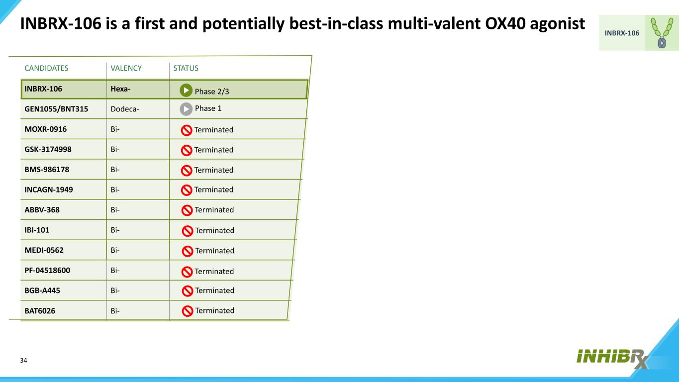 34 INBRX-106 INBRX-106是首个且可能是同类最佳的多价OX40激动剂候选价值状态INBRX-106 Hexa-GEN1055/BNT315 Dodeca-MOXR-0916 Bi-GSK-3174998 Bi-BMS-986178 Bi-INCAGN-1949 Bi-ABV-368 Bi-IBI-101 Bi-MEDI-0562 Bi-PF-04518600 Bi-BGB-A445 Bi-BAT6026 Bi-Phase 1 terminated Phase 2/3 terminated terminated terminated terminated terminated terminated terminated terminated terminated terminated terminated terminated terminated terminated terminated terminat