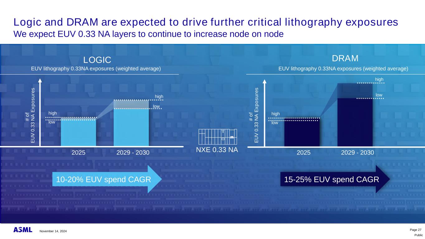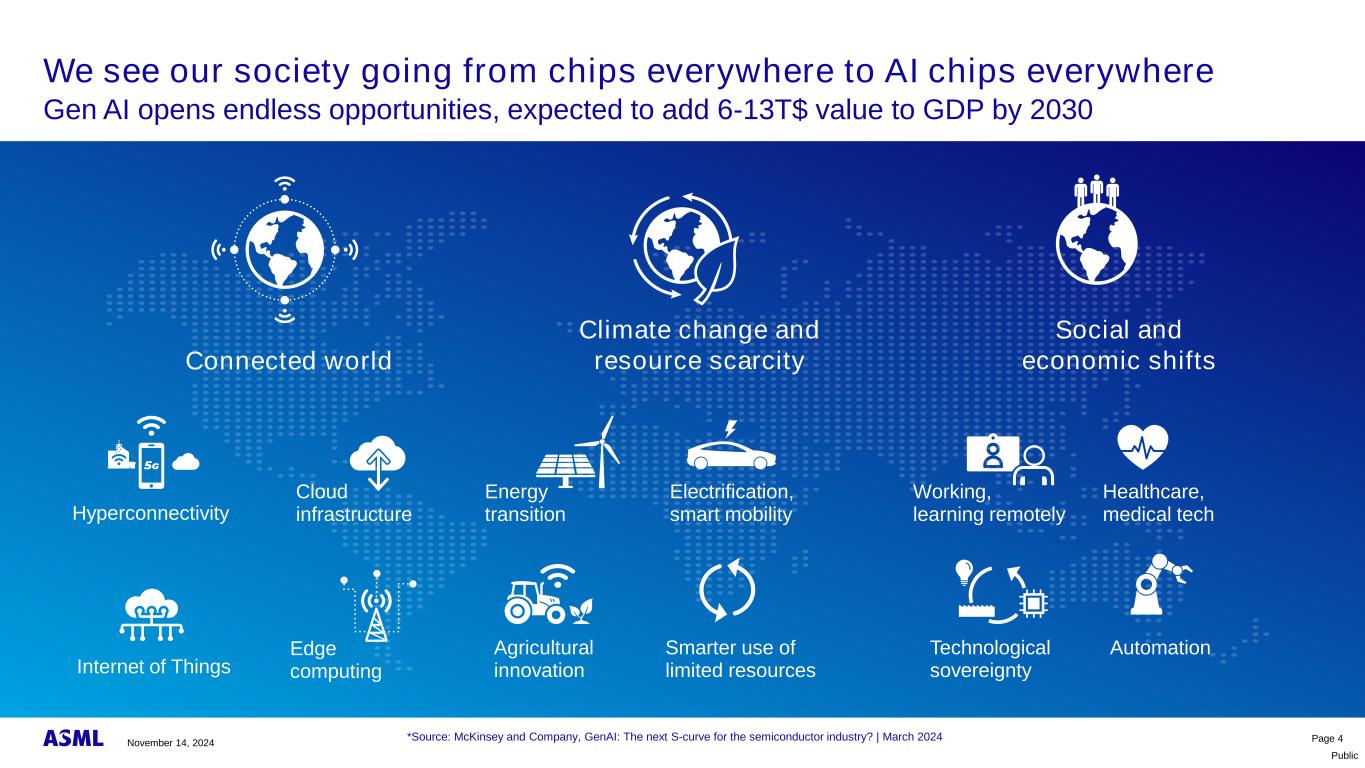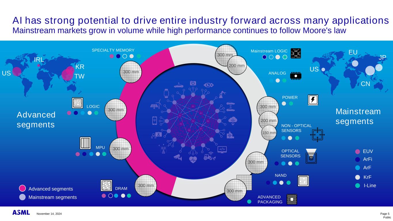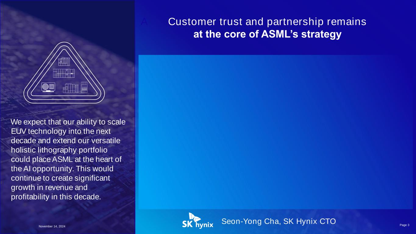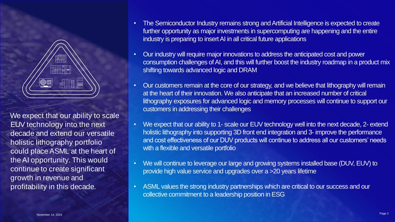 大众•半导体行业保持强劲,随着对超级计算的重大投资正在发生,以及整个行业正准备在所有关键的未来应用中插入人工智能,预计人工智能将创造更多机会•我们的行业将需要重大创新,以应对人工智能预期的成本和功耗挑战,这将在产品组合转向先进逻辑和DRAM的过程中进一步推动行业路线图•我们的客户仍然是我们战略的核心,我们相信光刻技术仍将是他们创新的核心。我们还预计,更多用于先进逻辑和内存工艺的关键光刻曝光将继续支持我们的客户应对他们的挑战•我们预计,我们将EUV技术1扩展到下一个十年的能力,2将整体光刻扩展到支持3D前端集成和3提高我们DUV产品的性能和成本效益,将继续通过灵活和多功能的产品组合满足客户的所有需求•我们将继续利用我们庞大且不断增长的系统安装基础(DUV,EUV)在> 20年的生命周期内提供高价值服务和升级• ASML重视强大的行业合作伙伴关系,这对我们的成功以及我们对ESG领导地位的集体承诺至关重要。我们预计,我们将EUV技术扩展到下一个十年并扩展我们多才多艺的整体光刻产品组合的能力,可能会将ASML置于人工智能机会的核心。这将继续在本十年创造收入和盈利能力的显着增长。第2页2024年11月14日