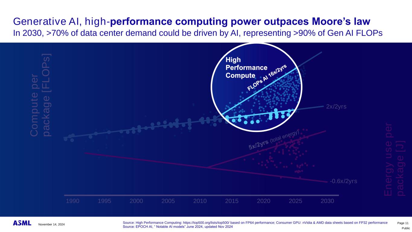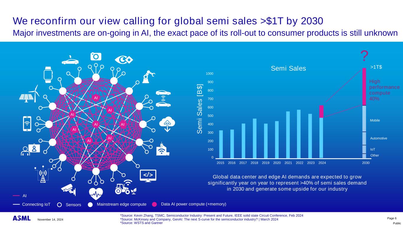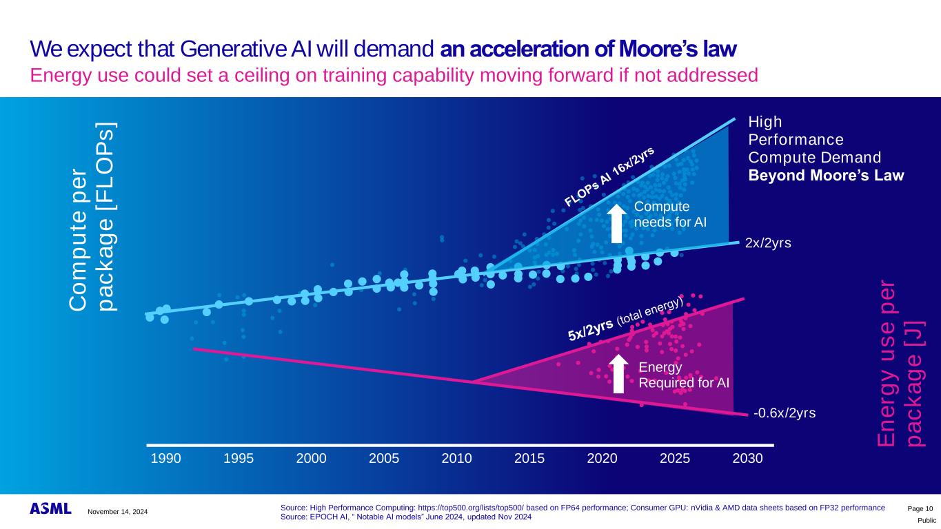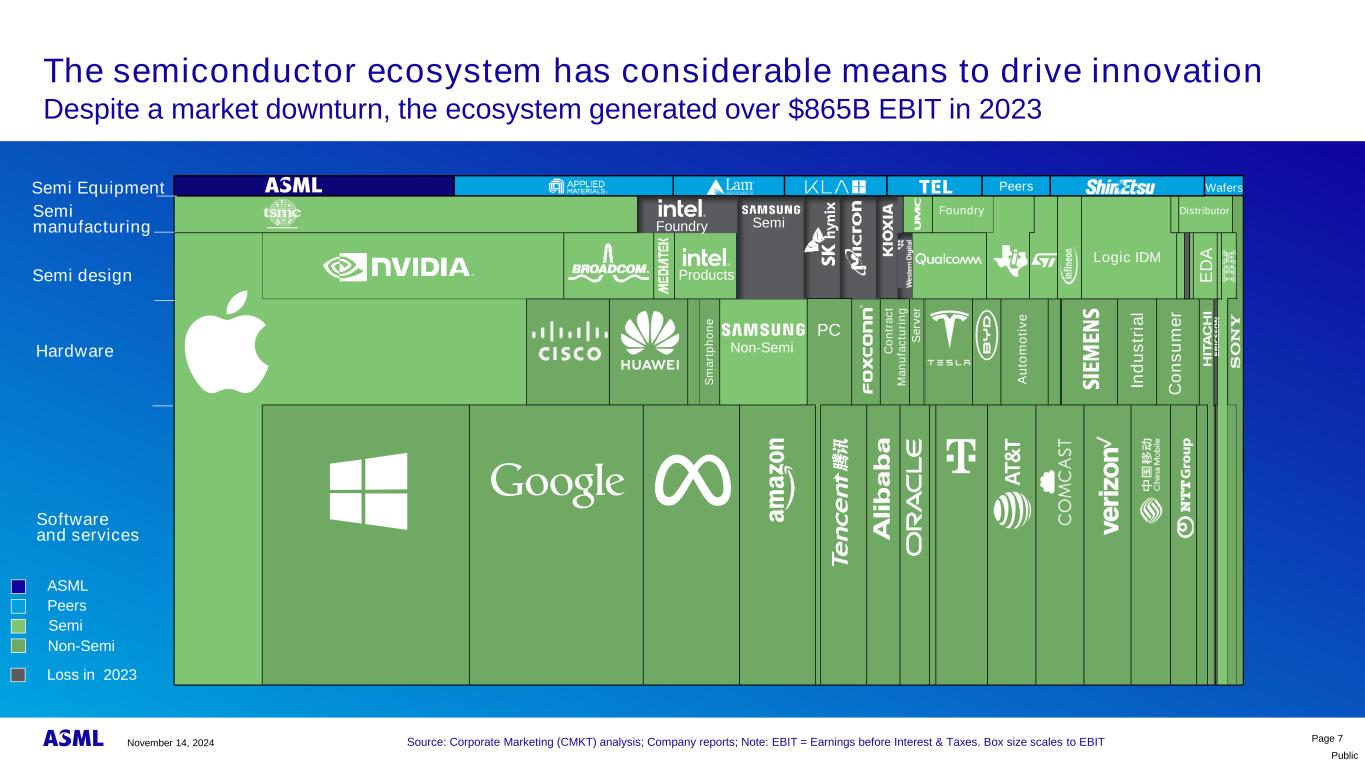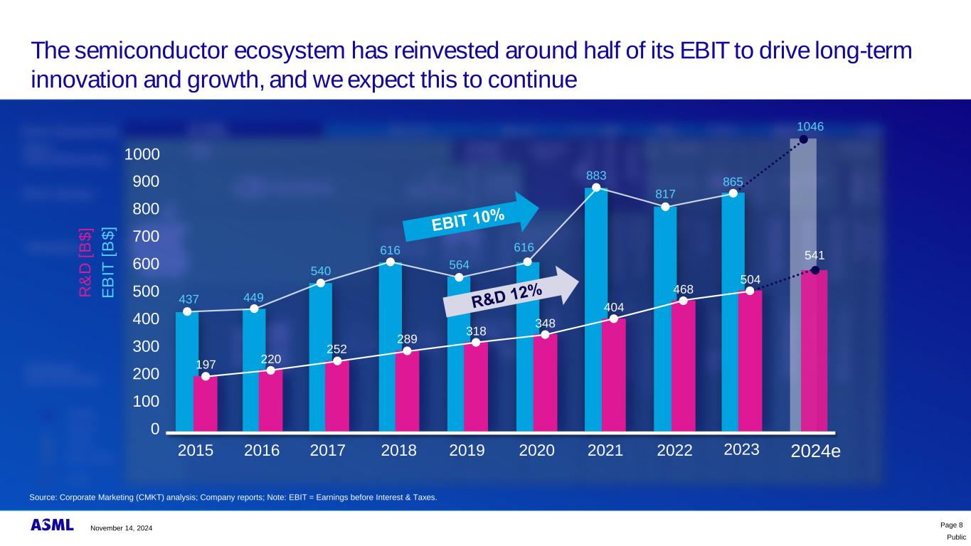 大众•半导体行业保持强劲,随着对超级计算的重大投资正在发生,以及整个行业正准备在所有关键的未来应用中插入人工智能,预计人工智能将创造更多机会•我们的行业将需要重大创新,以应对人工智能预期的成本和功耗挑战,这将在产品组合转向先进逻辑和DRAM的过程中进一步推动行业路线图•我们的客户仍然是我们战略的核心,我们相信光刻技术仍将是他们创新的核心。我们还预计,更多用于先进逻辑和内存工艺的关键光刻曝光将继续支持我们的客户应对他们的挑战•我们预计,我们将EUV技术1扩展到下一个十年的能力,2将整体光刻扩展到支持3D前端集成和3提高我们DUV产品的性能和成本效益,将继续通过灵活和多功能的产品组合满足客户的所有需求•我们将继续利用我们庞大且不断增长的系统安装基础(DUV,EUV)在> 20年的生命周期内提供高价值服务和升级• ASML重视强大的行业合作伙伴关系,这对我们的成功以及我们对ESG领导地位的集体承诺至关重要。我们预计,我们将EUV技术扩展到下一个十年并扩展我们多才多艺的整体光刻产品组合的能力,可能会将ASML置于人工智能机会的核心。这将继续在本十年创造收入和盈利能力的显着增长。第2页2024年11月14日