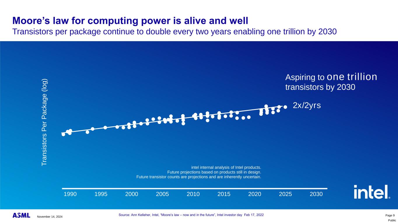 公共计算能力的摩尔定律还活着并且很好每个封装的晶体管继续每两年翻一番,从而能够在2030年前达到一万亿个来源:nn Kelleher,ntel,“摩尔定律——现在和未来”,ntel投资者日2022年2月17日,T ra n s是要rs P e r P a c k a g e(lo g)志在到2030年达到一万亿个晶体管的intel内部分析英特尔产品。基于仍在设计中的产品的未来预测。未来的晶体管计数是预测,本质上是不确定的。200520102015202020252030200019951990第9页2x/2yrs 2024年11月14日