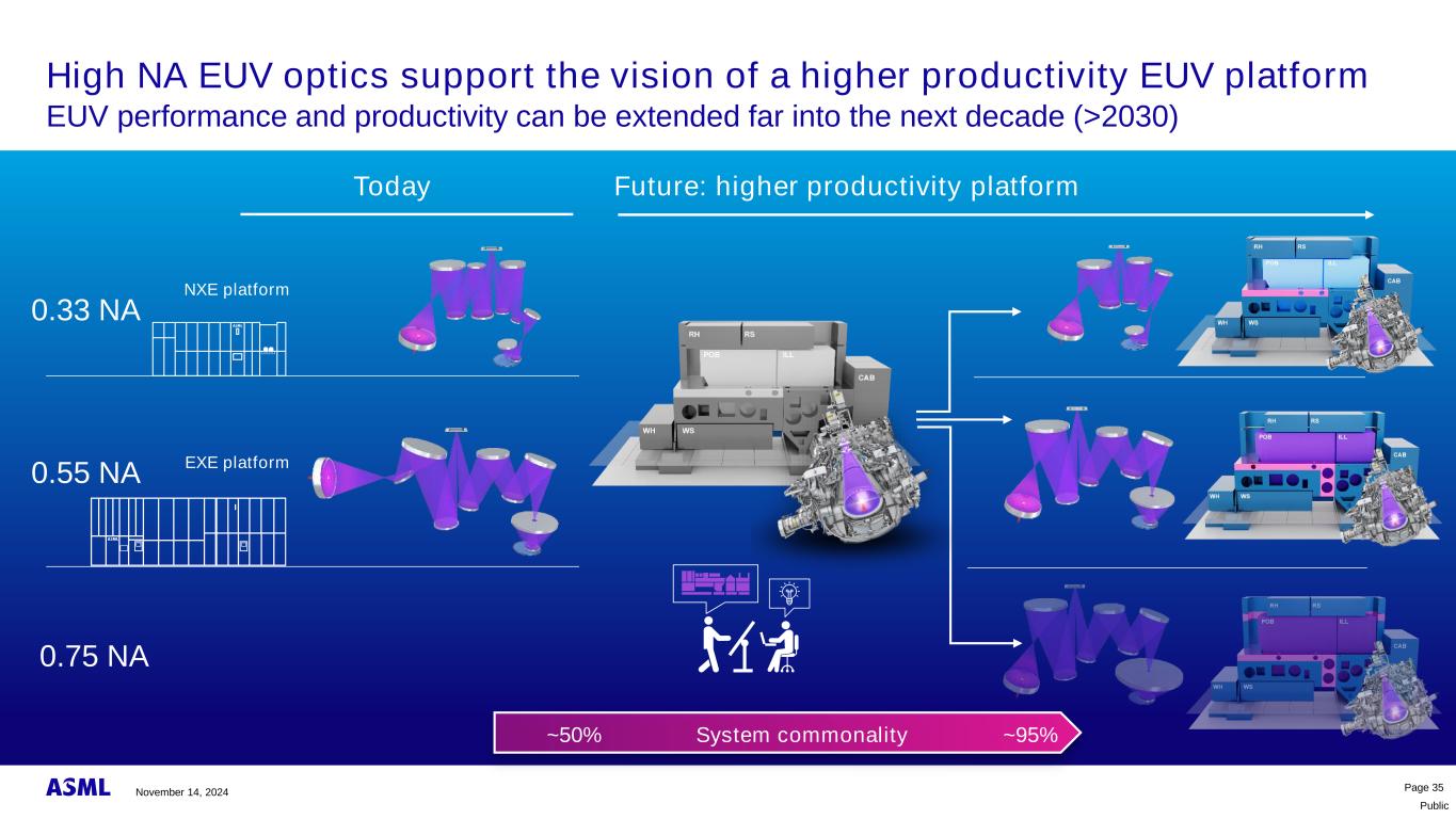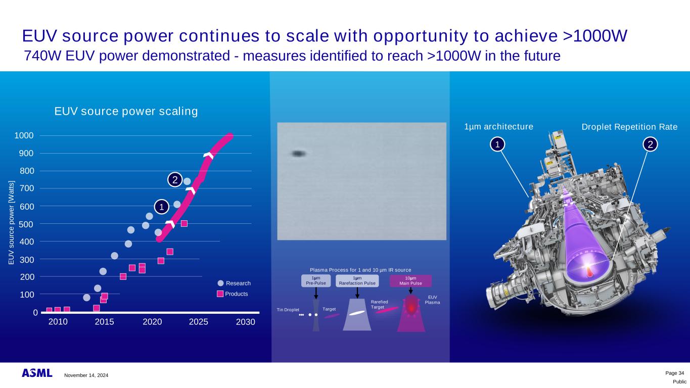公共EUV源功率持续规模化有机会实现> 1000W 740W EUV功率演示EUV源功率规模化20102015202020250100200300400500600 E U V s o u rc e p o w e r [ W a tts ]产品2037008009001000-确定未来达到> 1000W的措施12研究1 EUV等离子体1 μ m预脉冲1 μ m细化脉冲10 μ m主脉冲2等离子体工艺用于1和10 μ m红外源靶材稀化靶材锡滴1 μ m架构液滴重复率第34页2024年11月14日