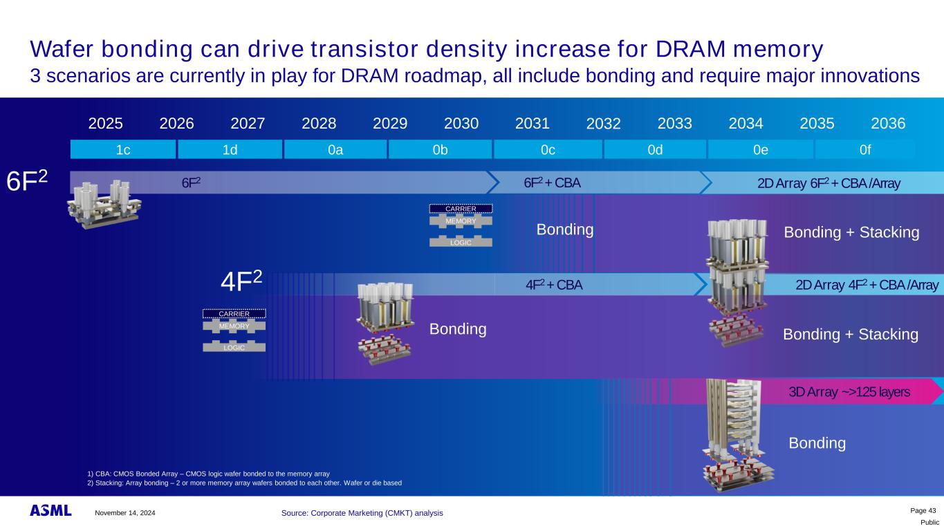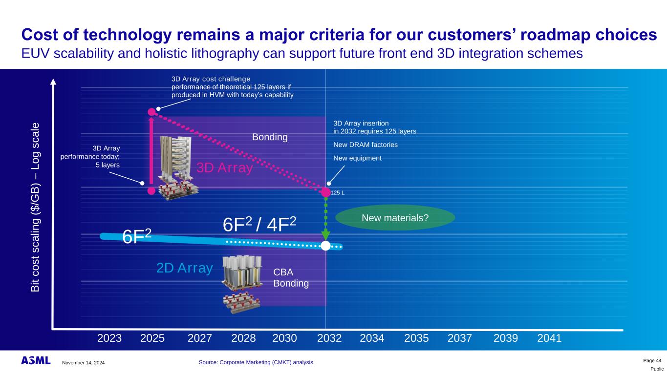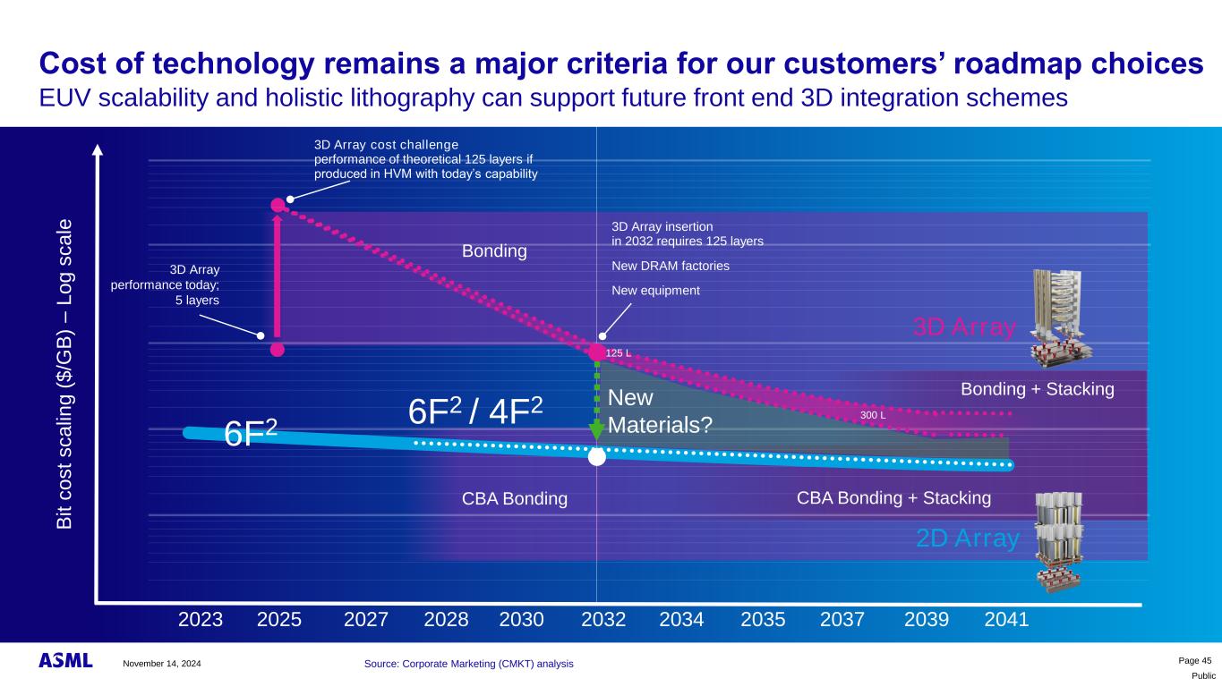Public Bonding CBA Bonding Cost of Technology remains a major criteria for our customers ' roadmap choices EUV scalability and wholistic polithography can support future front end 3D integration schemes page44 20232025202720282030203220342035203720392041 b it c o s t s c a lin g($/g b)– L o g s c a le 3D Array performance today;5 layers 3D Array cost chIf produced in HVM with today's capacity 6F2/4F2 6F2 3D array insertion in 2032 requires 125 layers new DRAM factories new equipment 125L new material?3D Array 2D Array来源:企业营销(CMKT)分析2024年11月14日
