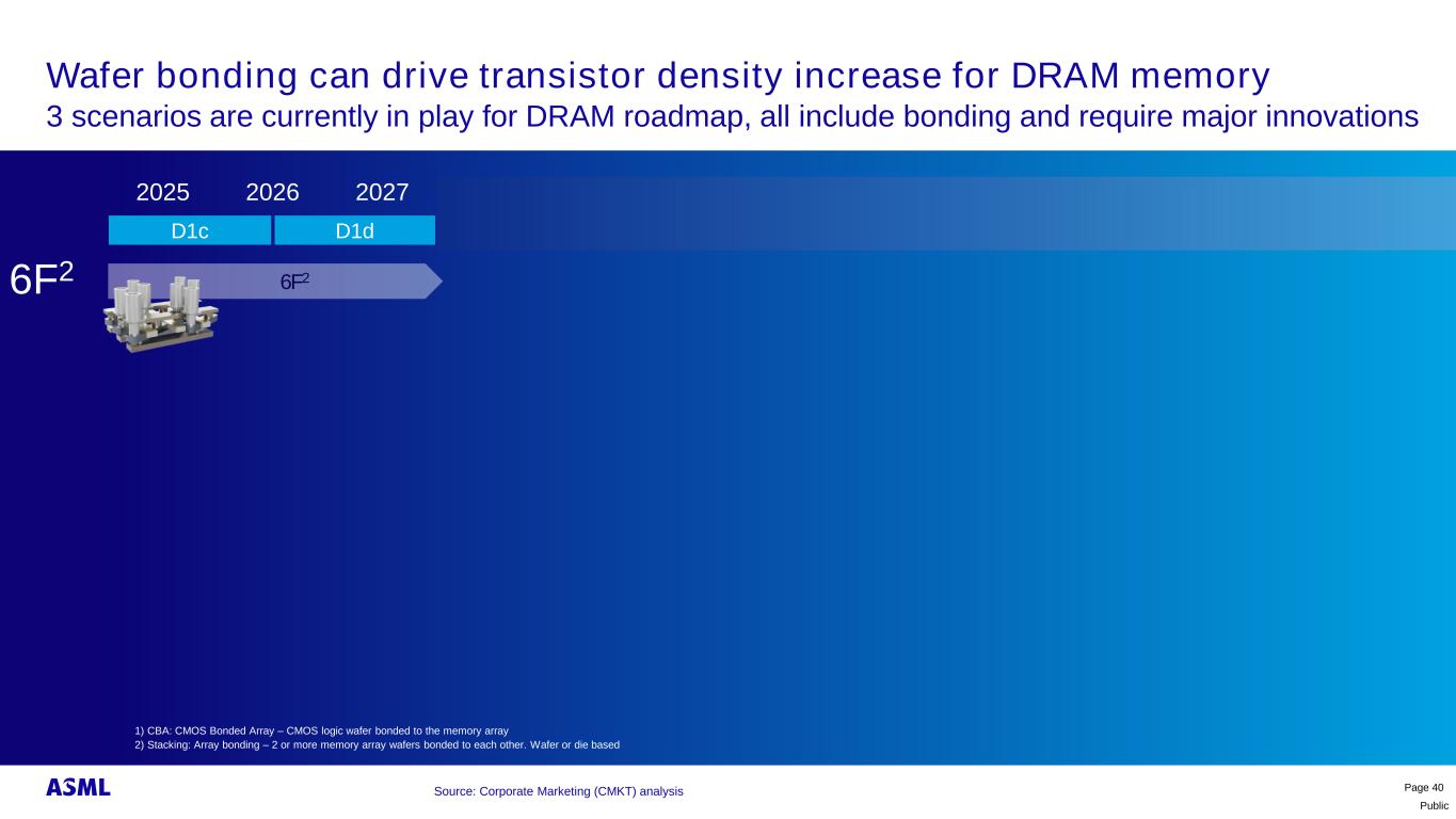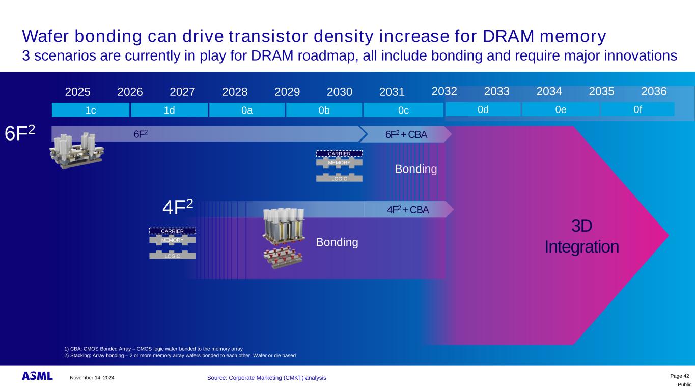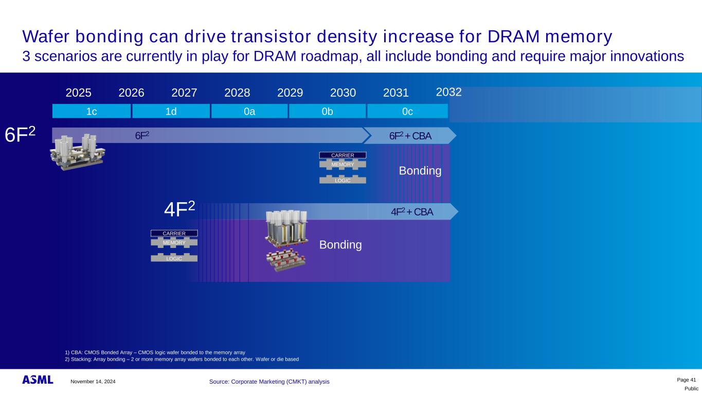 Public Bonding CBA Bonding Cost of Technology remains a major criteria for our customers ' roadmap choices EUV scalability and wholistic polithography can support future front end 3D integration schemes page44 20232025202720282030203220342035203720392041 b it c o s t s c a lin g($/g b)– L o g s c a le 3D Array performance today;5 layers 3D Array cost chIf produced in HVM with today's capacity 6F2/4F2 6F2 3D array insertion in 2032 requires 125 layers new DRAM factories new equipment 125L new material?3D Array 2D Array来源:企业营销(CMKT)分析2024年11月14日