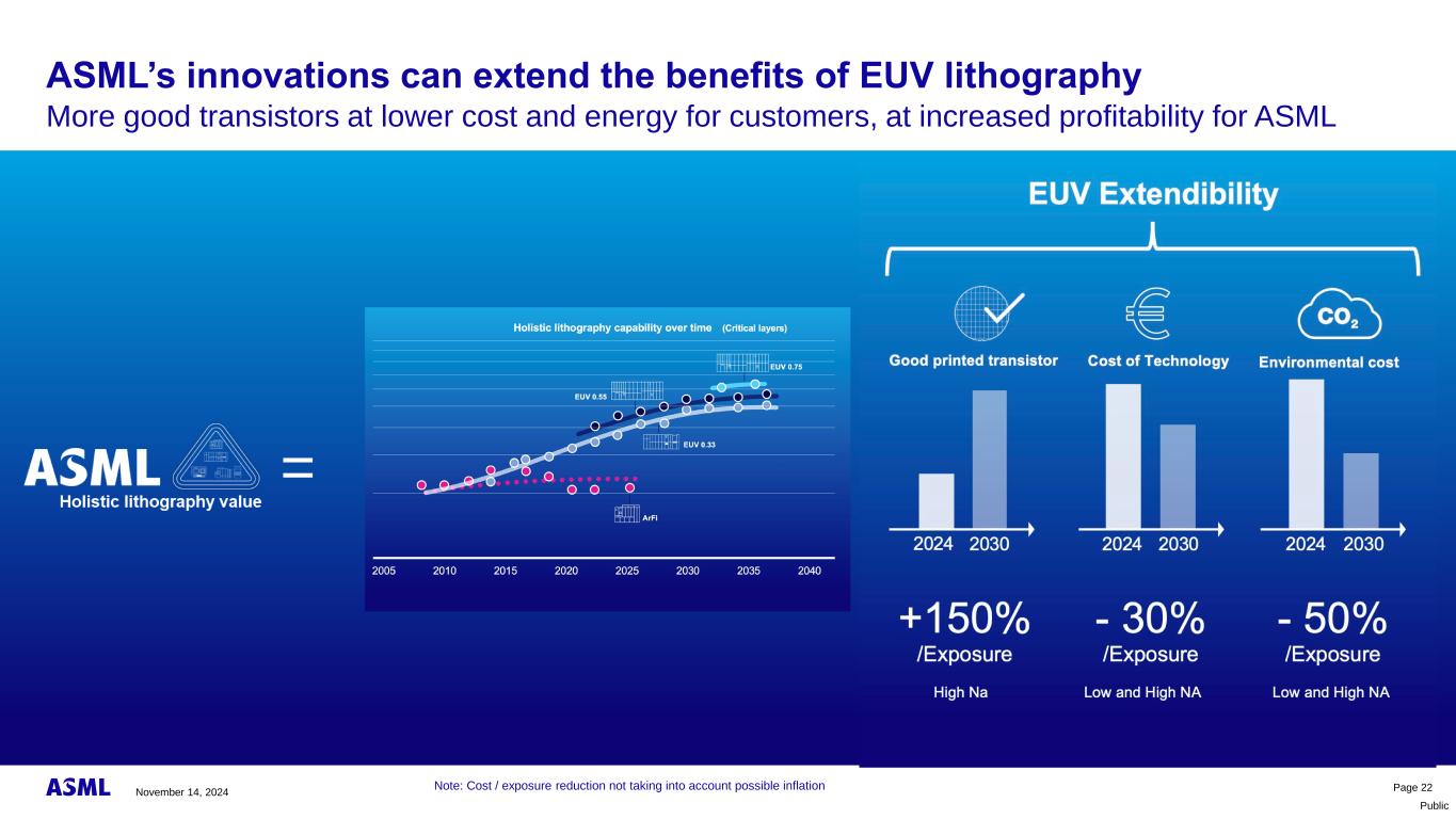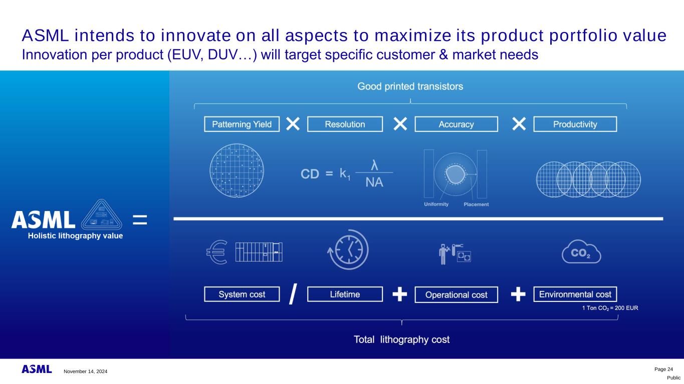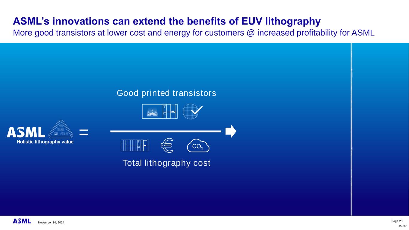 公开第23页=好的印刷晶体管光刻总成本CO2 ASML的创新可以扩展EUV光刻的好处以更低的成本和能源为客户提供更多好的晶体管@为ASML增加盈利能力2024年11月14日