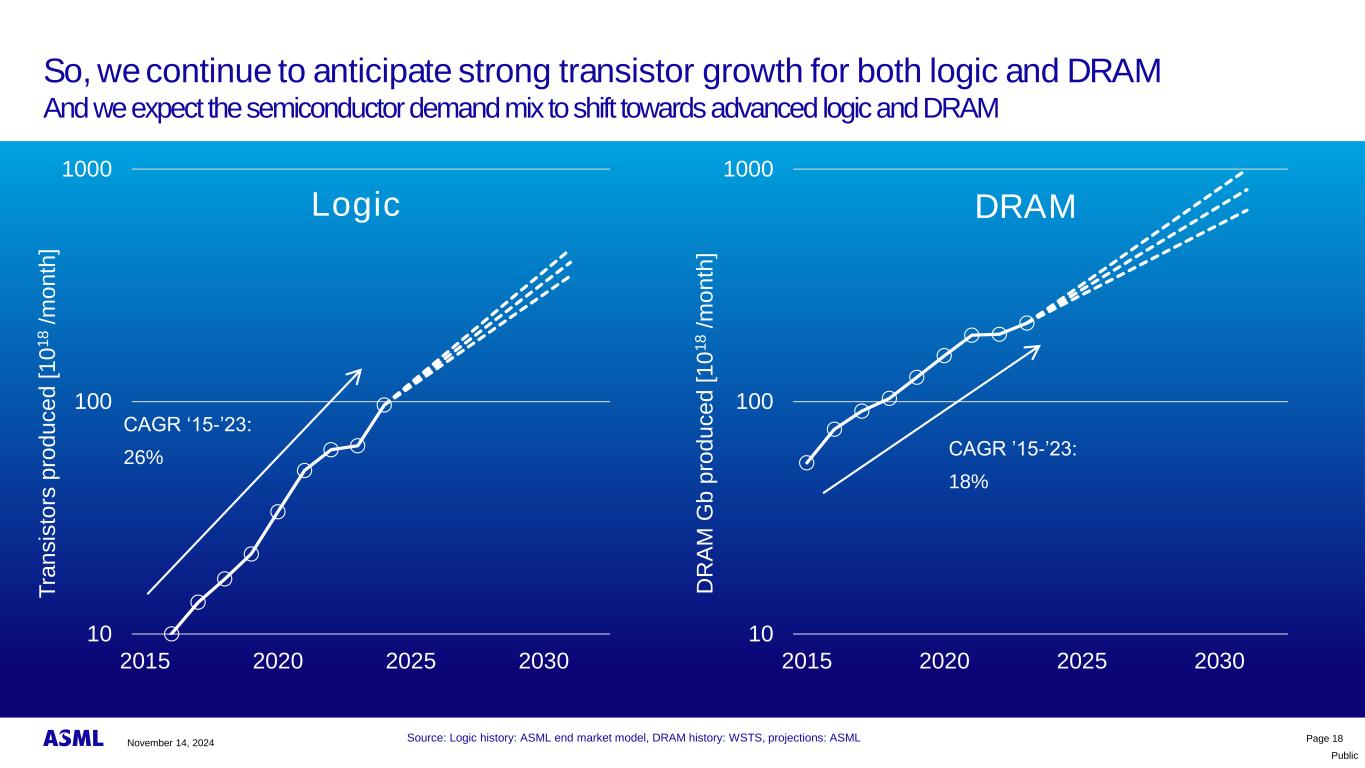 公用1010010002015202020252030因此,我们继续预计逻辑和DRAM的晶体管将强劲增长,我们预计半导体需求组合将转向先进的逻辑和DRAM Page 18 D R A M G b p ro d u c e d [ 1018/m o n th ] C GR’15-'23:18% DRAM来源:逻辑历史:ASML终端市场模型,DRAM历史:WSTS,预测:ASML 1010010002015202020252030 T ra n s is to rs p ro d u c e d [ 1018/m o n th ] C GR‘15-’23:26%逻辑2024年11月14日
