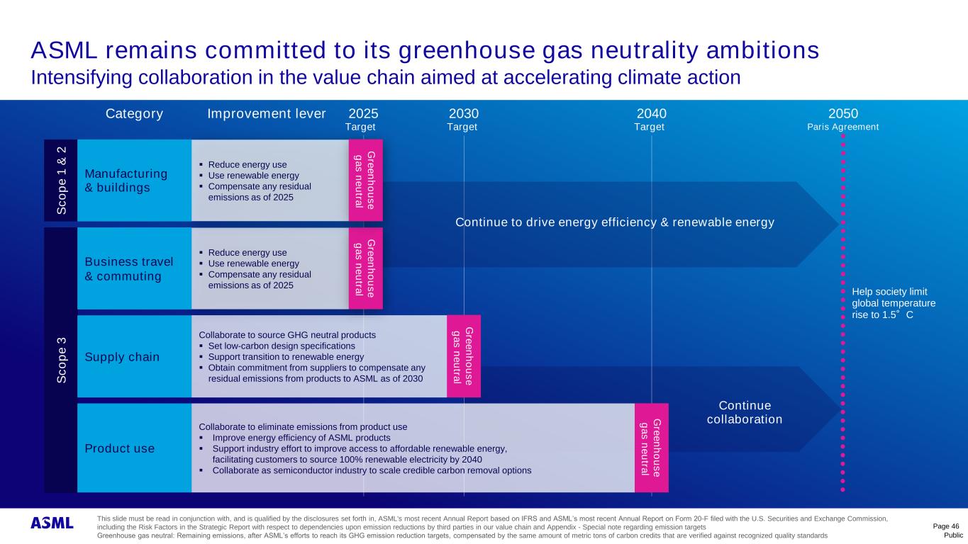 公众ASML仍然致力于实现其温室气体中和雄心加强价值链中的合作,旨在加速气候行动第46页帮助社会将全球气温上升限制在1.5 ° C的改善杠杆2025203020402050巴黎协定类别继续合作以消除产品使用产生的排放▪提高ASML产品的能效▪支持行业努力改善获得负担得起的可再生能源的机会,便利客户在2040年前获得100%可再生电力▪合作作为半导体行业的规模可信的碳去除选项合作采购GHG中性产品▪设定低碳设计规范▪支持向可再生能源过渡▪获得供应商的承诺,以补偿产品向ASML产生的任何剩余排放截至2030年G re e e n h o u s e g a s n e u tra l g re e n h o u s e g a s n e u tra l继续推动能效&可再生能源▪减少能源使用▪使用可再生能源▪补偿截至2025年的任何剩余排放量▪减少能源使用▪使用可再生能源▪补偿任何剩余排放截至2025年G re e e e e e e e e e e e e e e e e e e e e e e e e e e e e e e e e e e e e e e e e e e e e e e e e e e e e e e e e e e e e e e e e e e e e e e e e e e e e e e e e e e e e e e e e e e e e e e e e e e e e e e e e e e e e e e e e e e e e e e e e e e e e e e e e e e e e e e e e e e e e e e e e e e e e e e e e e e e e e e e e e e e e e e e e e e e eASML基于FRS的最近年度报告和SML向美国证券交易委员会提交的20-F表格的最近年度报告,包括战略报告中关于依赖我们价值链中的第三方减排量的风险因素和附录-关于排放目标的特别说明温室气体中性:剩余排放量,在SML努力达到其GHG减排目标后,以根据公认质量标准验证的相同数量的碳信用额作为补偿