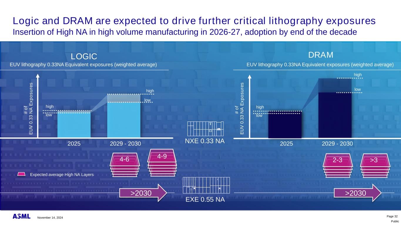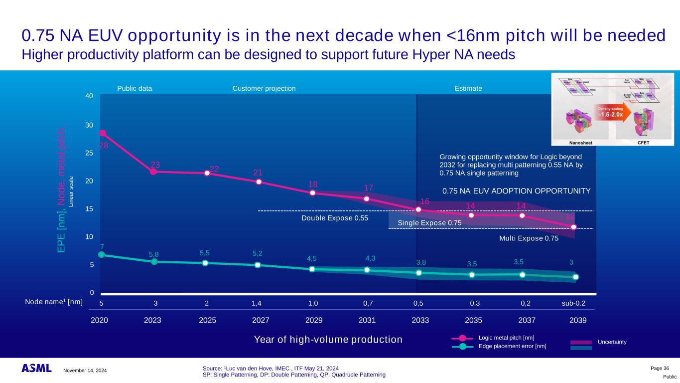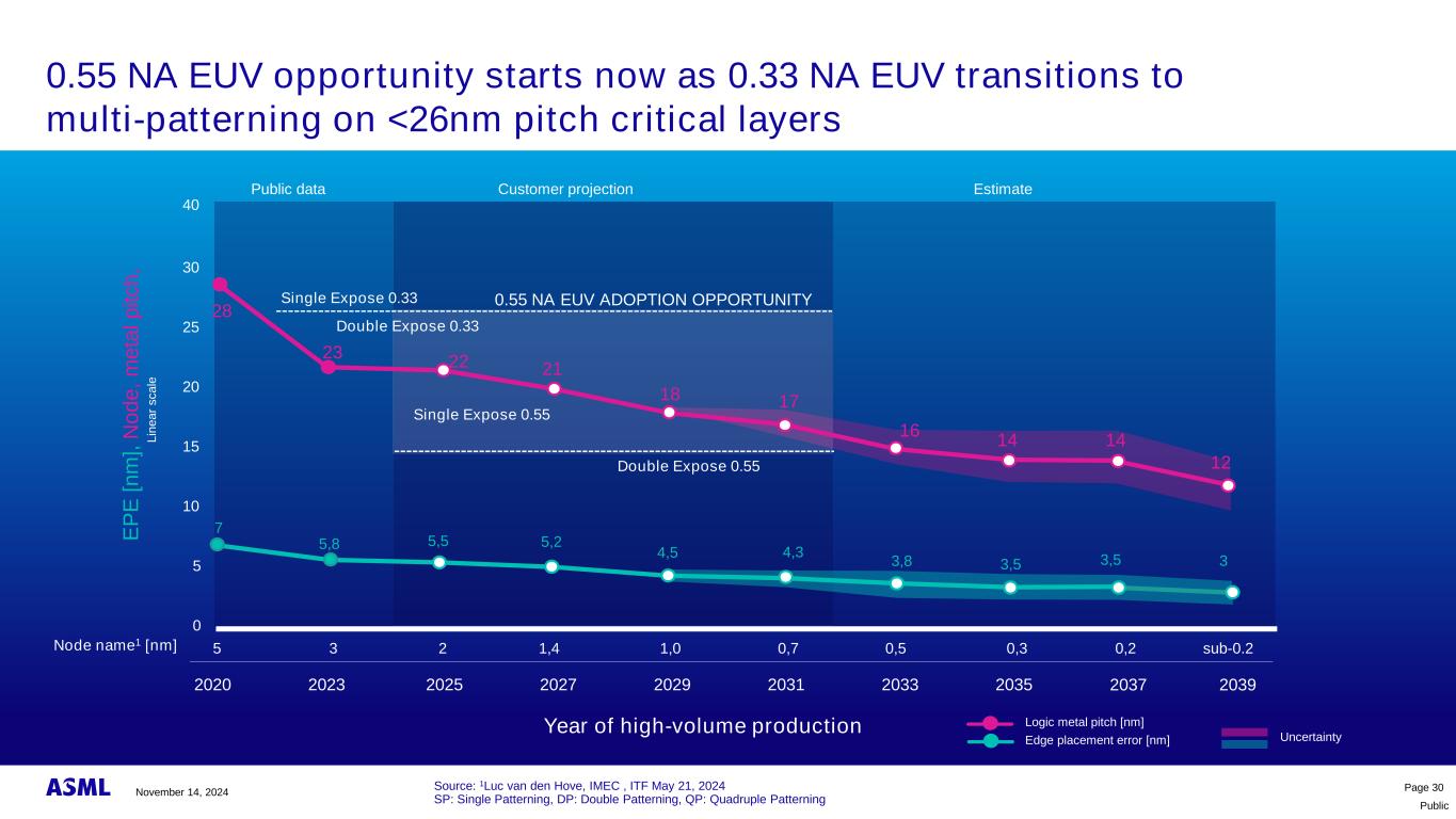 Public 0.55 NA EUV opportunity starts now as 0.33 NA EUV transitions to multi-patterning on < 26nm pitch critical layers SP:single patterning,DP:double patterning,QP:quadruple patterning source:1Luc van den Hove,IMEC,ITF May 21,202405 10153020 single expose 0.55 double expose 0.55 0.55 NA EUV adoption opportunity single expose 0.33 2521181614285,24,33,53,5 public data customer projectation estimate 2020202320252027202920312033203517143N o d e,m e ta l p it c h,l in e a r s c a le大批量生产年份7203920371235321,41,00,70,20,50,3 sub-0.2逻辑金属间距[ nm ]边缘放置误差[ nm ]不确定性5,54,55,8节点名称1 [ nm ] 40 pages 30November 14,2024