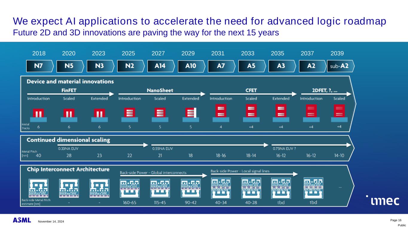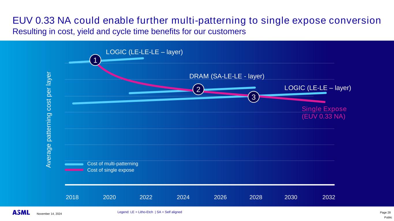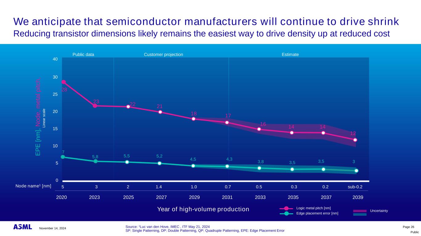 Public 0.55 NA EUV opportunity starts now as 0.33 NA EUV transitions to multi-patterning on < 26nm pitch critical layers SP:single patterning,DP:double patterning,QP:quadruple patterning source:1Luc van den Hove,IMEC,ITF May 21,202405 10153020 single expose 0.55 double expose 0.55 0.55 NA EUV adoption opportunity single expose 0.33 2521181614285,24,33,53,5 public data customer projectation estimate 2020202320252027202920312033203517143N o d e,m e ta l p it c h,l in e a r s c a le大批量生产年份7203920371235321,41,00,70,20,50,3 sub-0.2逻辑金属间距[ nm ]边缘放置误差[ nm ]不确定性5,54,55,8节点名称1 [ nm ] 40 pages 30November 14,2024
