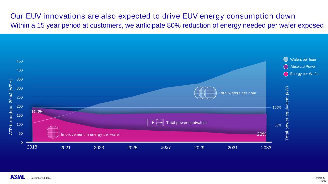 公共450400350300250200150100500我们的EUV创新也有望在15年内推动客户的EUV能耗下降,我们预计每片暴露的晶片所需能量将减少80% 2018202120232033每片晶片能量的改善总功率当量100%每片晶片绝对功率能量202520292031202720% 100% 50% A T P T H O U G H P U T 30 m J [ W P H ]每小时晶片T O TA L P O W E R E Q U IV A le n t(k W)每小时晶片总数2024年11月14日第47页