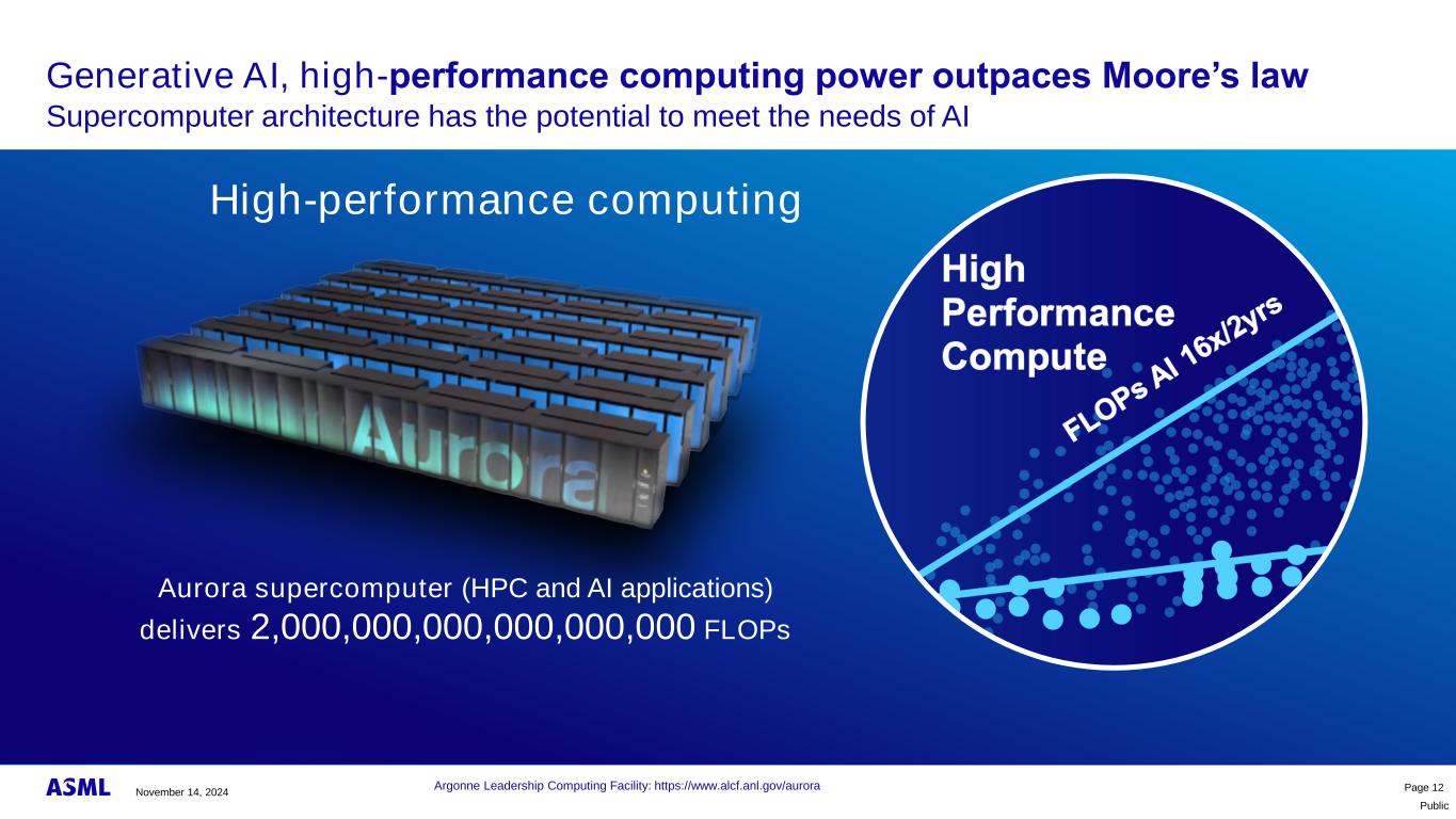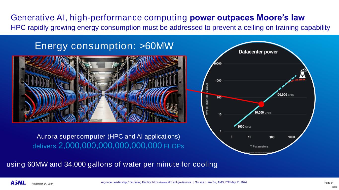 公共生成AI,高性能计算能力超越摩尔定律架构成本必须降低才能充分启用AI机会Aurora超级计算机(HPC和AI应用)提供2,000,000,000,000,000,000,000,000FLOP,使用~85K CPU/GPU,> 20PB内存用于计算,> 230PB内存用于存储,成本约为5亿美元成本:> 5亿美元第13页Argonne Leadership Computing Facility:https://www.alcf.anl.gov/aurora 2024年11月14日