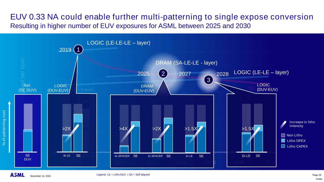 Public EUV 0.33 NA可以使多图案进一步转换为单次曝光转换,从而为我们的客户带来成本、产量和循环时间收益page 28 202220242026202820302032 Single Expose(EUV 0.33 NA)a v e ra g e p a tt e rn in g c o s t p e r la y e r 20182020 LOGIC(LE-LE-LE – layer)DRAM(SA-LE-LE-layer)LOGIC(LE-LE – layer)213 Legend:LE = Litho-Etch | SA =自对齐多图案成本单次曝光成本2024年11月14日