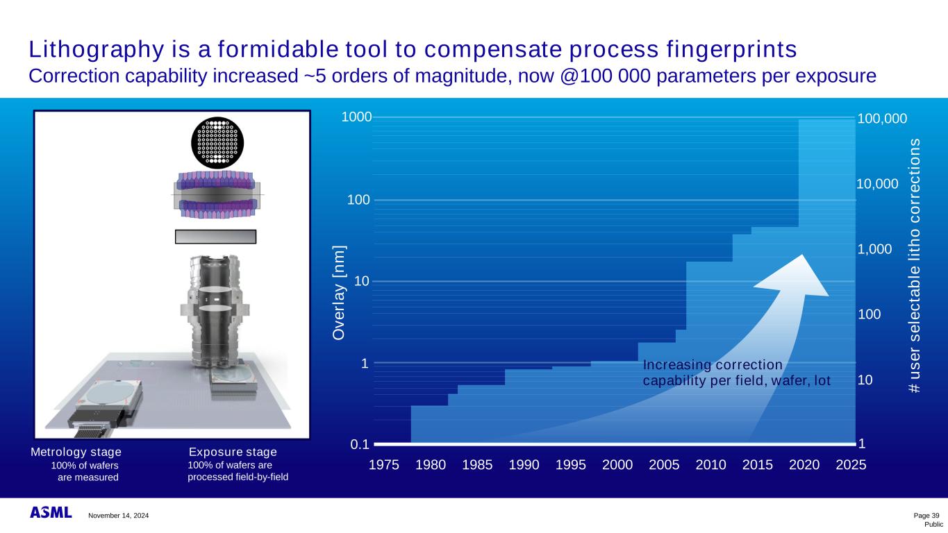 公共光刻是补偿工艺指纹的强大工具校正能力提升~5个数量级,now @每次曝光阶段100000个参数曝光阶段100%的晶圆被测量100%的晶圆被逐场处理计量阶段偶指奇数指灰滤波器X Y Z光学中心线剂量机械手柔性照明器栅格阶段1975198019851995199520002005201020152020202510001001010.1 o v e rl a y [ n m ] 1,0001001011,000 # u s e r s e le c ta b le l it h o c o rr e c ti o n s 100,000增加单场校正能力,晶圆、批次扫描仪和过程控制软件2024年11月14日第39页