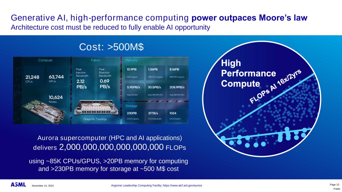 公共生成AI,高性能算力超越摩尔定律超级计算机架构有潜力满足AI需求Page 12高性能计算C o m p u te [ F lo p s ] 2x/2yrs摩尔定律E n e rg y u s e [ J ](Energy per flop)-0.4x/2yrs Energy per flop + compute eff。-0.6x/2yrs 3x/2yrs计算效率200520102015202020252030200019951990 Argonne Leadership Computing Facility:https://www.alcf.anl.gov/aurora高性能计算Aurora超级计算机(HPC和AI应用)交付2,000,000,000,000,000FLOP 2024年11月14日