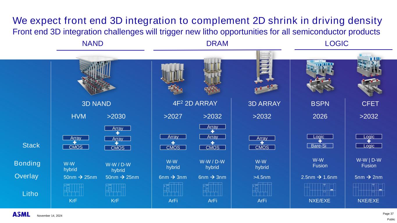 公共我们预计前端3D集成将补充2D在驱动密度上的收缩前端3D集成挑战将引发新的litho机会面向所有半导体产品第37页Stack LOGIC W-W混合W-W Fusion W-W | D-W Fusion Overlay 3D NAND BSPN CFET HVM2026 > 2032 Array CMOS Logic Bare-Si Logic Bonding 5nm → 2nm50nm → 25nm 2.5nm → 1.6nm Litho KrF NXE/EXE TERM/EXE Array W-W/D-W hybrid array CMOS 50nm → 25nm KrF NAND DRAM W-W hybrid W-W/D-W hybrid 3D ARRAY4F2 2D array > 2027 > 2032 > 2032 Array CMOS Array CMOS Array > 4.5nm6nm → 3nm 6nm → 3nm ArFiArFi ArFi >