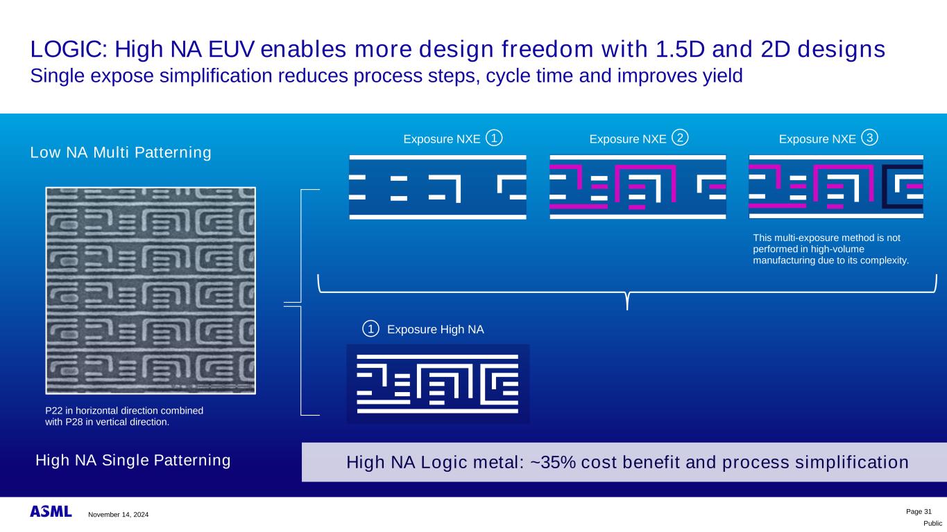Public LOGIC:高NAEUV使1.5D和2D设计具有更大的设计自由度单曝光简化减少了工艺步骤、循环时间并提高了良率水平方向的曝光NXE 1次曝光NXE 2次曝光NXE 3 P22结合垂直方向的P28。第31页这种多次曝光方法由于其复杂性,不能在大批量制造中进行。高NA单花纹低NA多花纹高NA逻辑金属:~35%成本效益和工艺简化暴露高NA1 2024年11月14日
