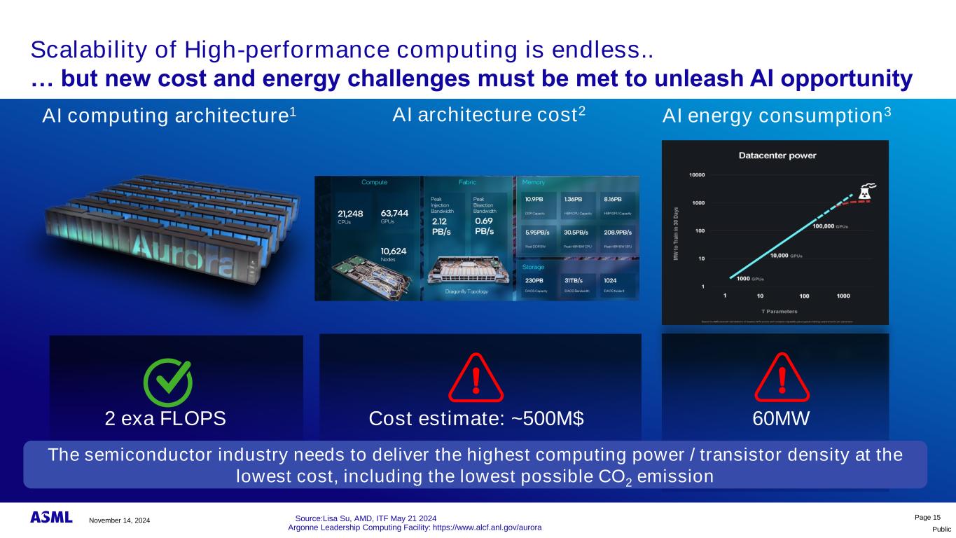 公共生成AI,高性能算力超越摩尔定律必须解决快速增长的能耗问题,以防止训练能力出现天花板19521960 1968200820161023102110191017101510131011109107105103101 T ra in in in g c o m p u te(f l o p s)d e e p l e a rn in g e ra in c lu d in g f e a tu re e x tr a c ti o n l a rg e s c a le e ra c o mb in in g c o m p le x d a ta s e ts Argonne Leadership Computing Facility:https://www.alcf.anl.gov/aurora。|来源:苏姿丰,AMD,ITF 5月21日202410252022 GEN E RA TI V E A I Aurora超级计算机(HPC和AI应用)使用60MW和每分钟34,00加仑的水用于冷却能源消耗,提供2,000,000,000,000,000,000FLOP:> 60MW page 14November 14,2024