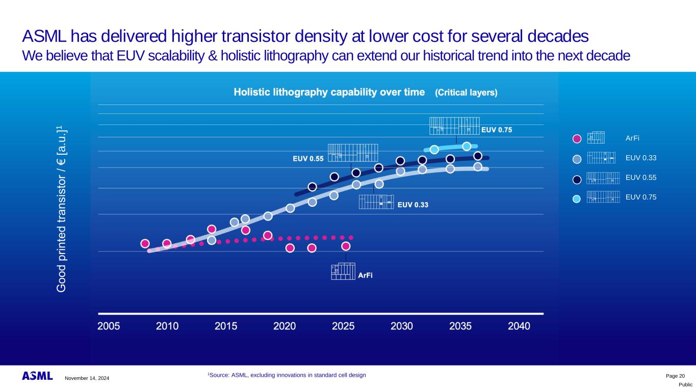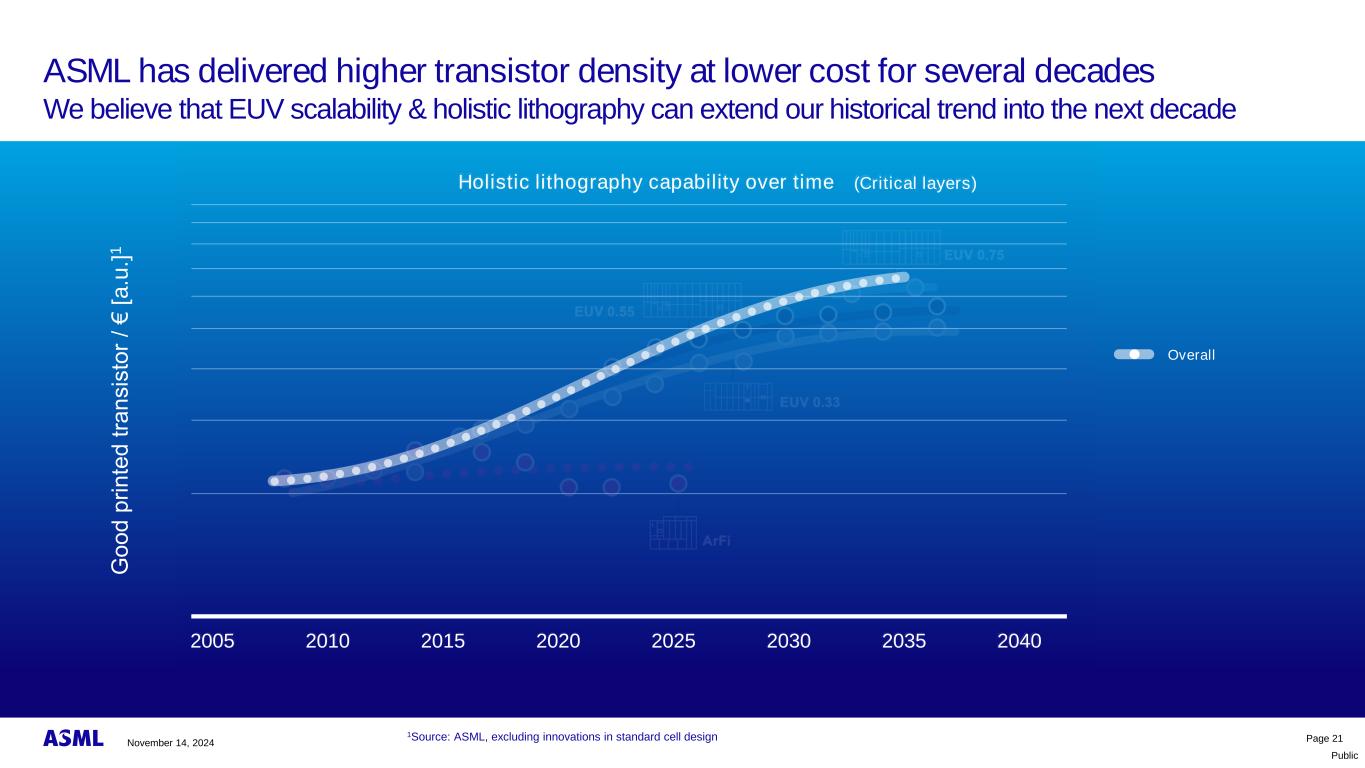 公开页面211来源:ASML,不包括标准电池片设计方面的创新G o o d p ri n te d t ra n s is to r/eU.1 [ a.u. ] 1 ASML几十年来以更低的成本提供了更高的晶体管密度我们相信EUV可扩展性和整体光刻可以将我们的历史趋势延伸到下一个十年(关键层)200520102015202020252025203020352040随着时间的推移整体光刻能力2024年11月14日