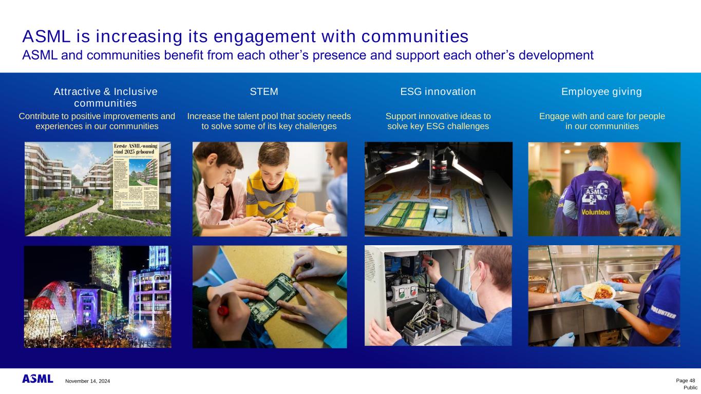 具有公共吸引力和包容性的社区STEM ESG创新员工为我们社区的积极改进和经验做出贡献增加社会解决一些关键挑战所需的人才库支持创新想法以解决关键的ESG挑战与我们社区中的人们互动并为他们提供关怀ASML正在增加与社区的互动SML和社区因彼此的存在而受益并支持彼此的发展2024年11月14日第48页