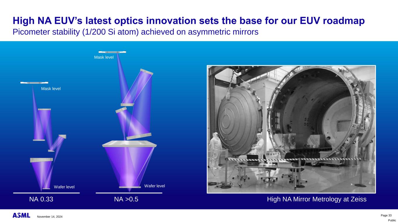 Public Logic和DRAM预计将推动进一步的关键光刻曝光,在2026-27年的大批量制造中插入高NA,到十年结束时采用20252029-2030 DRAMLOGIC 4-6 2-3预期平均高NA层第32页20252029-2030高低高低低High High # o f E U V 0.33 N A E x p o s u re s 4-9 EUV光刻0.33NA等效曝光(加权平均)> 2030 # o f E U V 0.33 N A E x p o s u re s > 2030 > 3 EUV光刻0.33NA等效曝光(加权平均)2024年11月14日