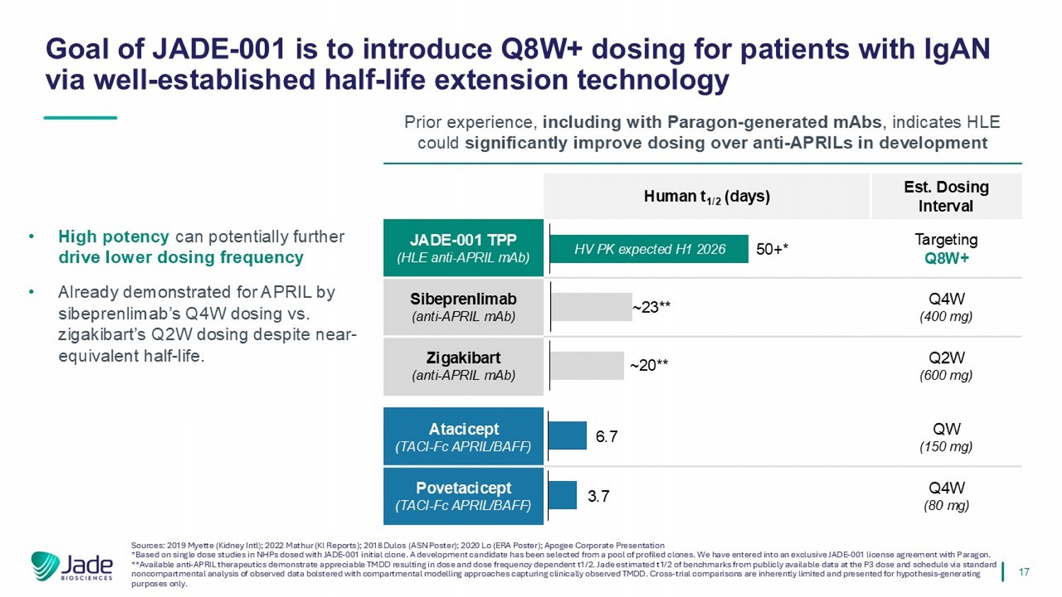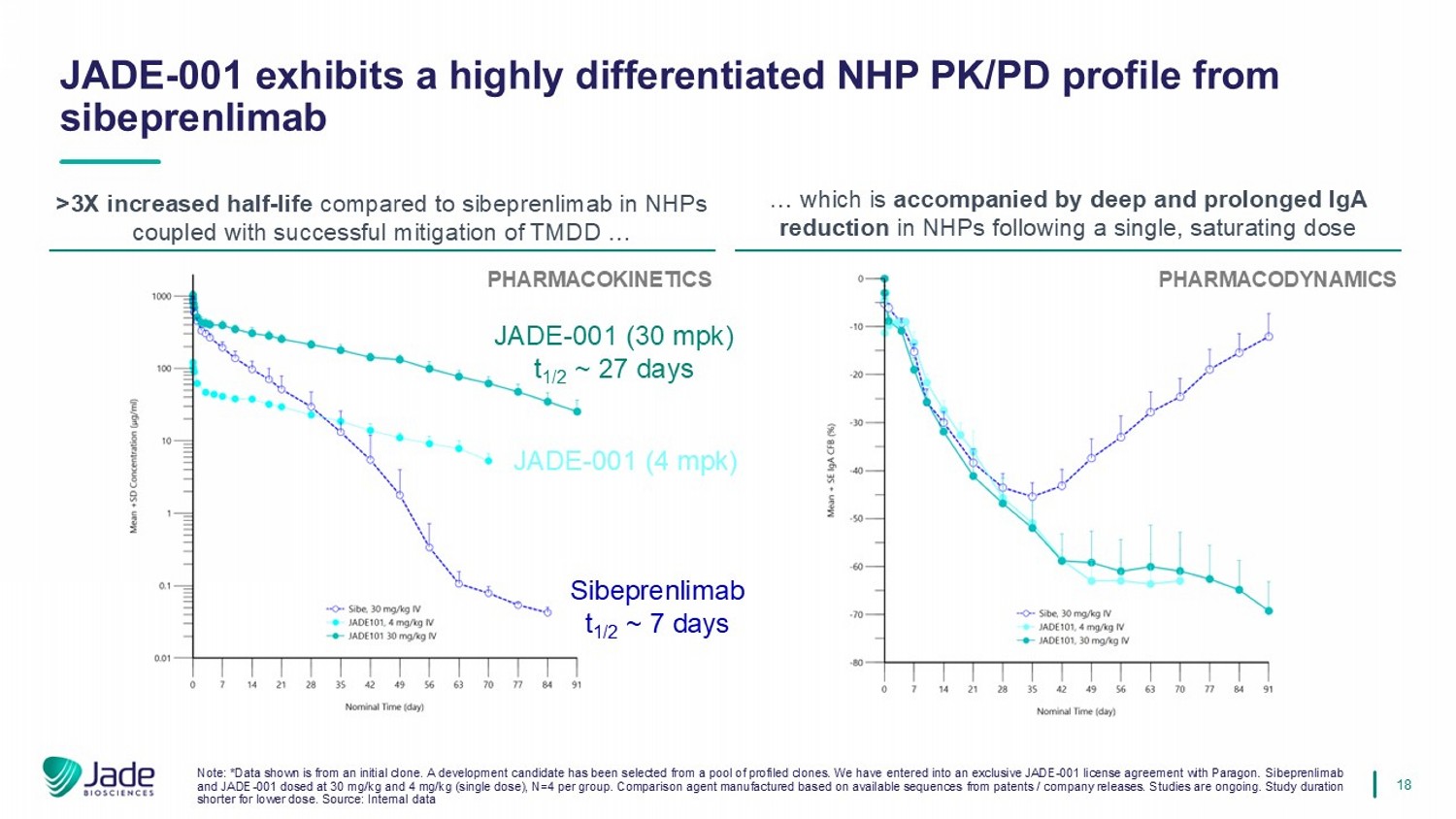 17 •高效力可能会进一步推动更低的给药频率•尽管接近等效半衰期,但sibeprenlimab的Q4W给药与zigakibart的Q2W给药已经证明了APRIL。资料来源:2019 Myette(Kidney Intl);2022 Mathur(KI报告);2018 Dulos(ASN海报);2020 LO(ERA海报);Apogee企业介绍*基于对JADE-001初始克隆给药的NHPs的单剂量研究。已从一个池中选择了一个开发候选者o f已分析的克隆。我们已与Paragon订立独家JADE-001许可协议。**可用的抗APRIL疗法证明了明显的TMDD导致剂量和剂量频率依赖于t1/2。Jade estim在P3剂量和时间表下,通过对观察数据的标准非隔室分析,在捕捉临床观察到的TM DD的隔室建模方法的支持下,从公开可用的数据中确定了t1/2的基准。交叉试验比较本质上是有限的,仅为假设生成目的而呈现。JADE-001的目标是通过成熟的半衰期延长技术为IgAN患者引入Q8W +给药先前的经验,包括使用Paragon生成的单抗,表明HLEC在开发EST中比抗APRILs显着改善给药。给药间隔人t1/2(天)靶向Q8W + JADE-001 TPP(HLE抗APRIL MAb)Q4W(400mg)Sibeprenliab(抗APRIL MAb)Q2W(600mg)Zigakibart(抗APRIL MAb)QW(150mg)Atacicept(TACI-FCAPRIL/BAFF)Q4W(80mg)Povetacicept(TACI-FCAPRIL/BAFF)~20**~23**50+*HV PK预计2026年上半年6.7 3.7