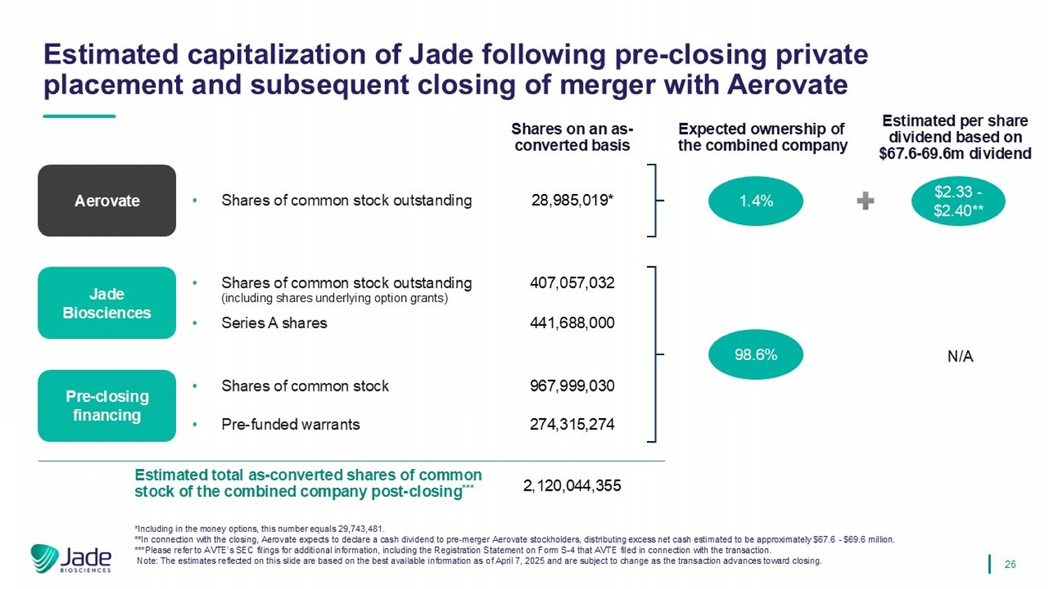 26日收盘后合并后公司普通股的估计总数为-已转换股份***2,120,044,355股按转换基准28,985,019*•已发行普通股股份Aerovate •已发行普通股股份(包括授予期权的基础股份)407,057,032 Jade Biosciences • A系列股份441,688,000股收盘前融资967,999,030 •普通股股份•预融资认股权证274,315,274预计d合并后公司的所有权1.4% 98.6% Jade在收盘前定向增发后的估计资本化并随后完成与Aerovate的合并*包括在货币期权中,这个数字等于29,743,481。**盘前,Aerovate预计将向合并前的Aerovate股东宣布现金股息,分配的超额净CAS h估计约为6.8-7亿美元。***请参阅AVTE提交给SEC的更多信息,包括AVTE就该交易填写的S-4表格上的注册声明。注:这张幻灯片中反映的估计是基于截至2025年4月7日的最佳可用信息,随着交易接近完成,可能会发生变化。E Stimated每股股息基于68-7000万美元股息2.35-2.42美元**不适用