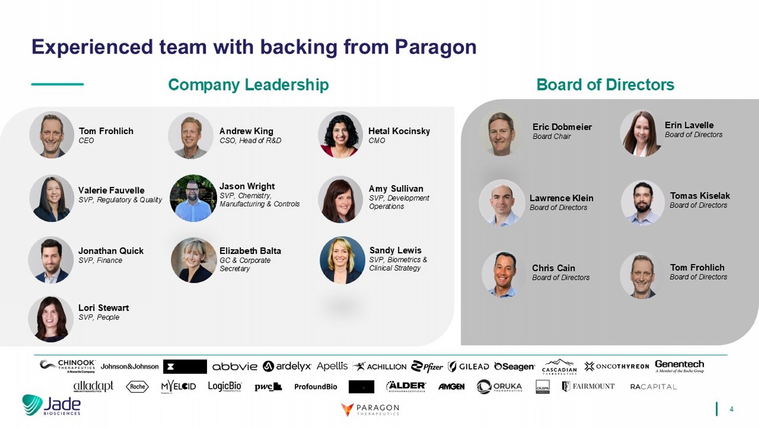 4经验丰富的团队,后盾来自Paragon Andrew King CSO、研发公司领导力主管Tom Frohlich首席执行官Valerie Fauvelle高级副总裁、监管与质量Hetal Kocinsky首席营销官Jonathan Quick高级副总裁、财务Amy Sullivan高级副总裁、开发运营Elizabeth Balta GC &公司秘书Sandy Lewis生物识别与临床战略高级副总裁Jason Wright高级副总裁、化学、制造与控制丨劳伦斯克莱因Eric Dobmeier董事会主席Chris Cain董事会丨Erin Lavelle Erin Lavelle董事会Tom Frohlich董事会Lori Stewart高级副总裁、人民