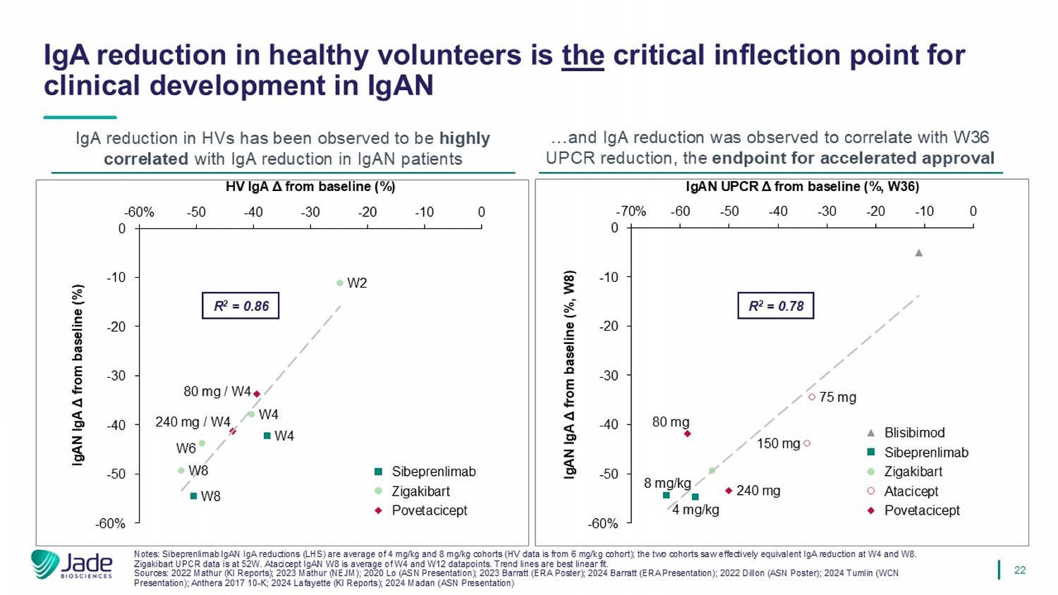 21美国早期临床概念验证和加速批准的潜在路径• NHP和1期PK/PD可以提供临床活动的早期信号;已观察到健康志愿者的IgA减少与临床活动高度相关。•预测肾功能保存的9个月蛋白尿数据,支持在eGFR确认性数据之前加速批准和更快上市的潜力。概念验证IGA健康志愿者数据预计在2026年上半年潜在适应症潜在健康志愿者数据第1阶段启动发现计划MOA IGAN 1H 2026 2H 2025进行中JADE-001 anti-April