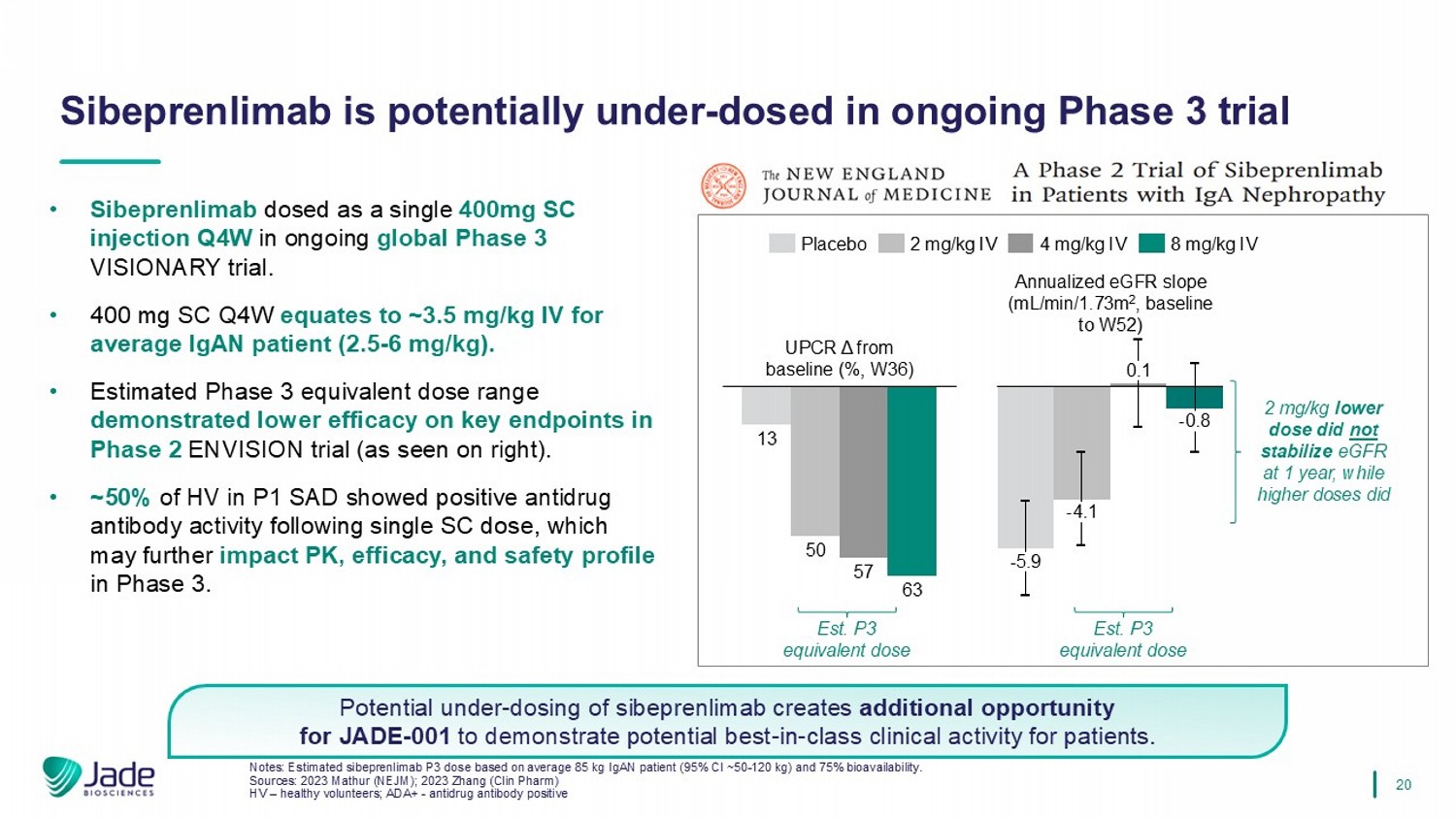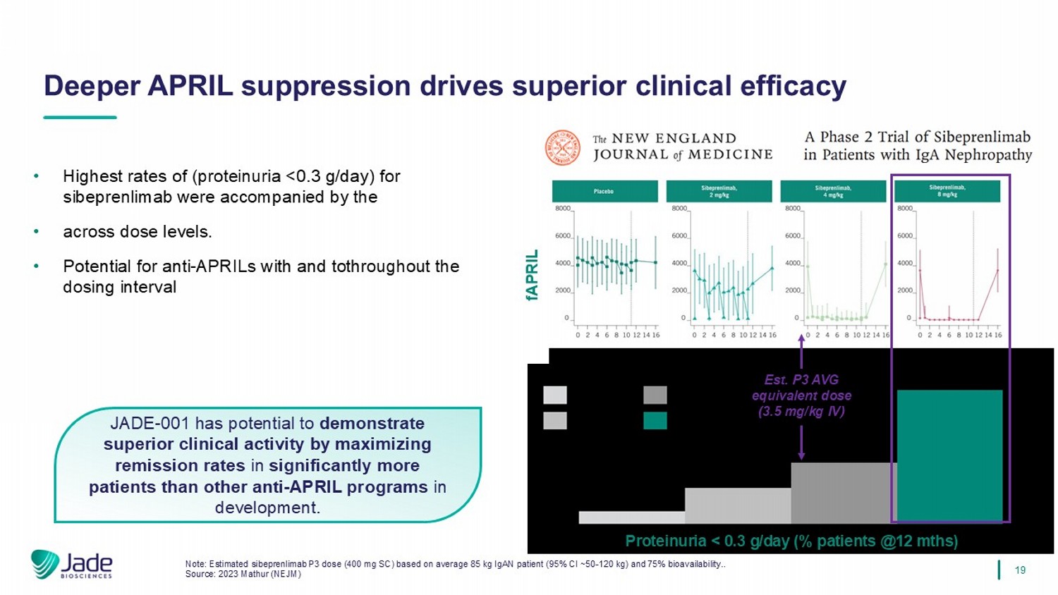 19 JADE-001有潜力通过最大限度地提高患者的缓解率来证明优于其他在研抗APRIL项目的临床活性。• sibeprenlimab的最高比率(蛋白尿< 0.3g/天)伴随着不同剂量水平的•。•在整个给药间隔期间抗APRILs的潜力注:根据平均85公斤IgAN患者(95% CI~50-120公斤)和75%生物利用度估计sibeprenlimab P3剂量(400毫克SC).。来源:2023 Mathur(NEJM)更深的APRIL抑制驱动卓越的临床疗效fAPRIL EST。P3 AVG等效剂量(3.5mg/kg IV)蛋白尿< 0.3g/day(%患者@12mths)