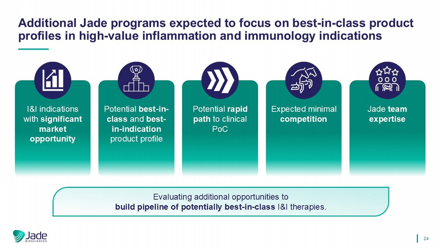 24个额外的Jade项目预计将专注于具有重大市场机会的高值炎症和免疫学适应症I & I适应症中的同类最佳产品概况潜在的同类最佳和最佳适应症产品概况进入临床POC的潜在快速路径预计竞争最小Jade团队的专业知识评估建立潜在的同类最佳I & I疗法管道的额外机会。