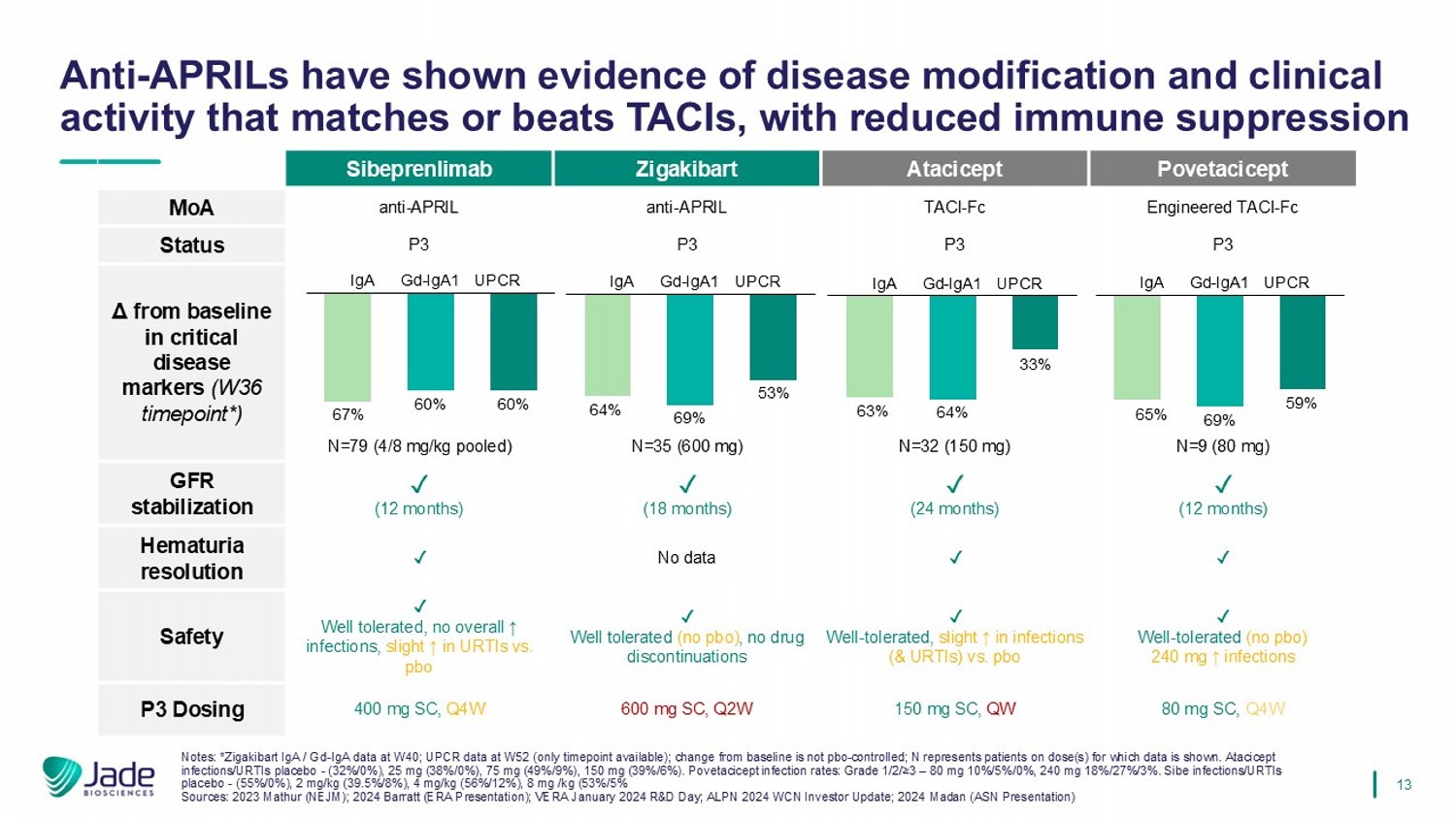 12 IgAN临床研究中蛋白尿和IgA的减少表明APRIL抑制是TACI-FC疗效背后的驱动力注:跨试验比较本质上是有限的,仅用于产生假设的目的。从出版物未提供具体数值的图表中数字化的数据。仅在N > 5时包含的值。Blisibimod W52数据来自W60。资料来源:Anthera 201710-K;2023 Mathur(NEJM);2023 Barratt(ERA海报);2024 Lafayette(KI报告);2024 Tumlin(WCN介绍);2024 Madan(ASN介绍)0481216202428323640444852-70%-60-50-40-30-20-100 10周24h UPCR μ from Baseline(%)Blisibimod(anti-BAFF)Sibeprenlimab(anti-APRIL,8 mg/kg)Sibeprenlimab(anti-APRIL,4 mg/kg)Zigakibart(anti-APRIL)Atacicept(TACI-FC,150 mg)AATACI-FC,240mg)波韦西西普(英文:TACI-FC,80毫克)0481216202428323640444852-70-60-50-40-30-20-10 0-80 %周IgA rea from baseline(%)