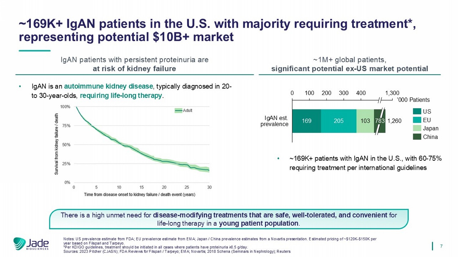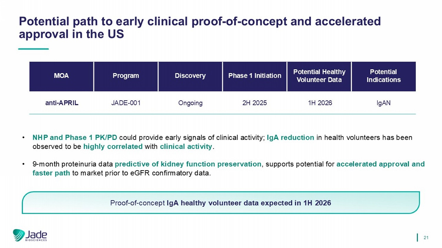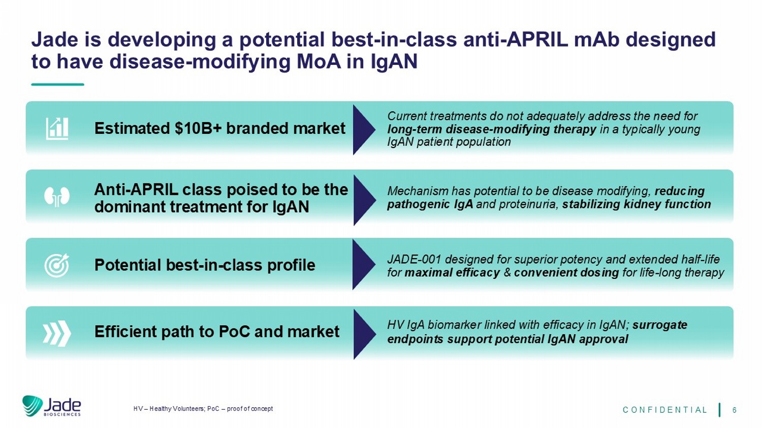 6个HV –健康志愿者;POC –概念验证Jade正在开发一种潜在的同类最佳抗APRIL MAB,旨在使IgAN中的疾病修饰MoA保密估计10B +美元的品牌市场目前的治疗方法未能充分满足典型的年轻IGAN患者群体对长期疾病修饰疗法的需求,该机制有可能是疾病修饰,减少致病性IGA和蛋白尿,稳定肾功能潜在的同类最佳配置文件JADE-001专为卓越效力和延长半衰期而设计,以实现最大功效和方便的终生给药-长期治疗获得POC的有效途径和与IGAN疗效相关的上市HV IgA生物标志物;替代终点支持潜在的IGAN批准Anti-APRIL类有望成为IGAN的主导治疗