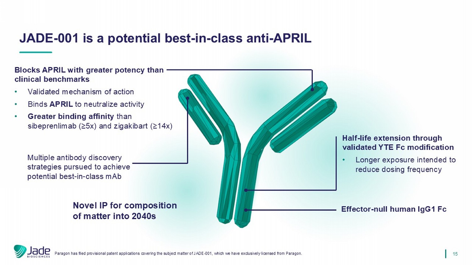 15 JADE-001是一种潜在的同类最佳抗APRIL阻断APRIL,其效力高于临床基准•经过验证的作用机制•结合APRIL以中和活性•比sibeprenlimab(≥ 5x)和zigakibart(≥ 14x)效应器-null人IgG1 FC更强的结合亲和力-通过经过验证的YTEFC修饰延长半衰期•旨在降低给药频率的更长时间暴露Paragon已提交涵盖JADE-001主题的临时专利申请,我们已独家授权fr om Paragon。追求多种抗体发现策略,以实现潜在的同类最佳MAB新型IP,用于2040年代的物质组成