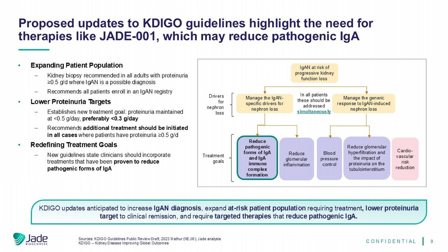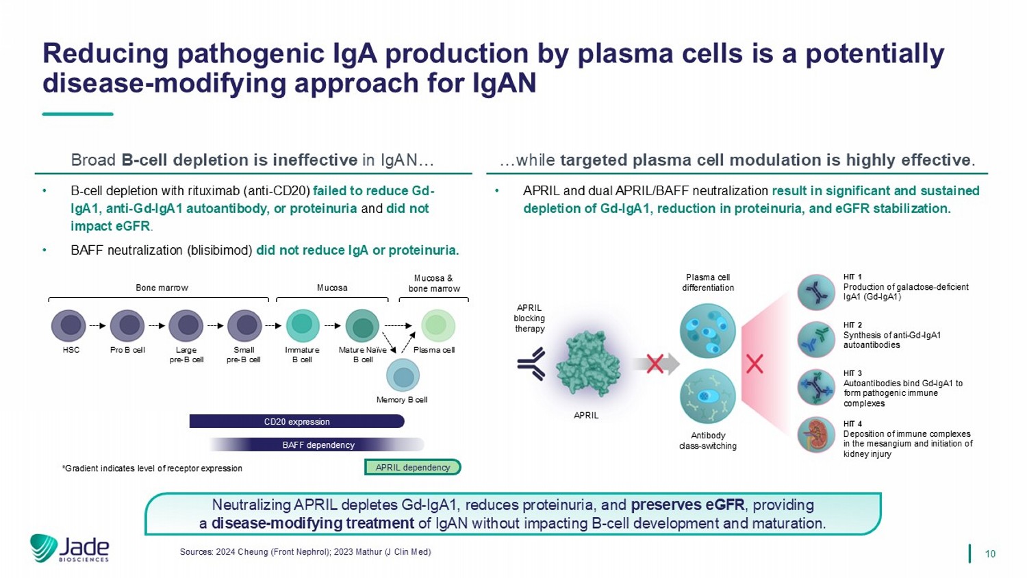 9来源:KDIGO指南公开审查草案;2023 Mathur(NEJM);Jade analysis KDIGO –肾脏疾病改善全球结果KDIGO指南的拟议更新突出了对JADE-001等疗法的需求,这可能会减少病原性IgA机密KDIGO更新,预计会增加IgAN诊断,扩大需要治疗的风险患者群体,降低蛋白尿目标到临床缓解,并需要降低病原性IgA的靶向治疗。存在进行性肾功能丧失风险的IgAN管理IgAN-肾单位丢失的特定驱动因素管理对IgAN诱导的肾单位丢失的通用反应所有患者肾单位丢失的驱动因素这些应同时解决减少IgA和IgA免疫复合物的致病形式形成减少肾小球炎症血压控制减少肾小球过滤以及蛋白尿对肾小管间质的影响心血管风险降低•扩大患者群体——推荐所有蛋白尿≥ 0.5g/d且IgAN为可能诊断的成人进行肾脏活检——建议所有患者参加IgAN登记•降低蛋白尿目标——确立新的治疗目标:蛋白尿维持在< 0.5g/日,最好是< 0.3克/天丨建议在所有患者蛋白尿≥ 0.5克/天的情况下应开始额外治疗•重新定义治疗目标丨新指南规定临床医生应纳入已被证明可降低致病形式的IgA治疗目标的治疗