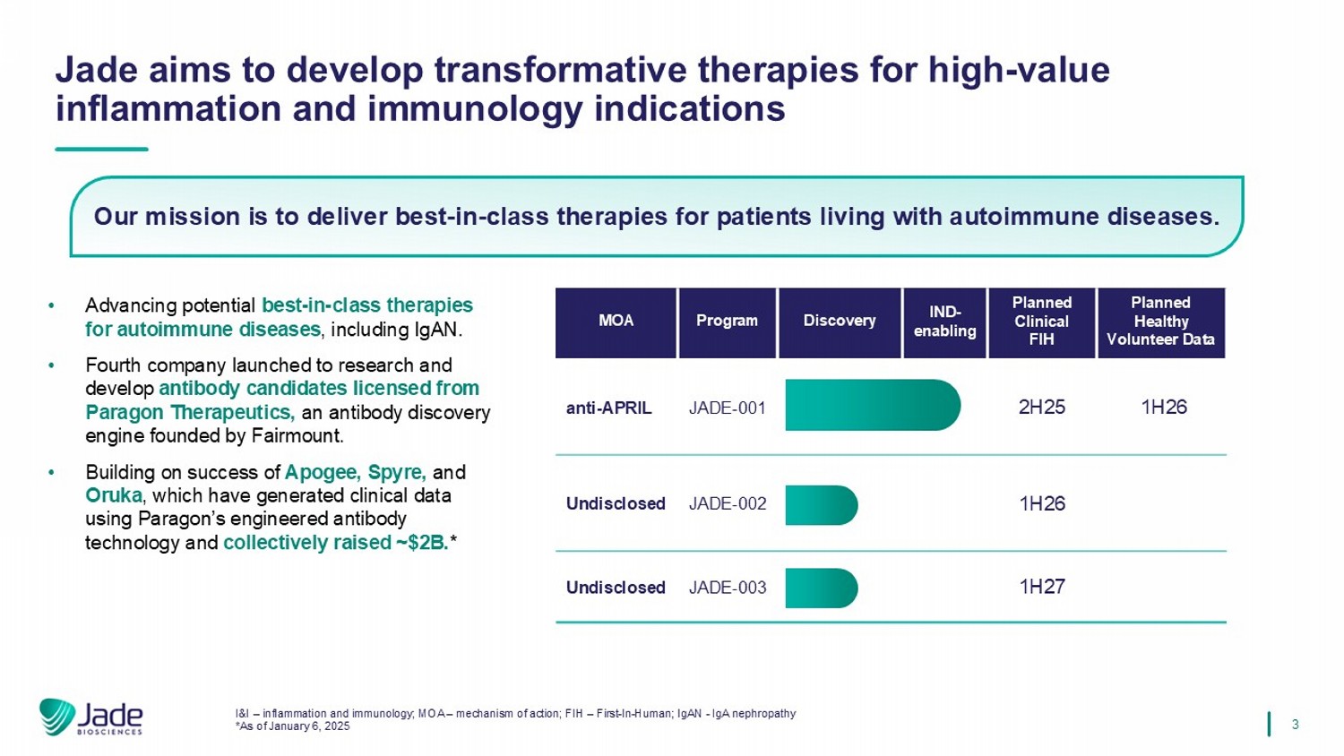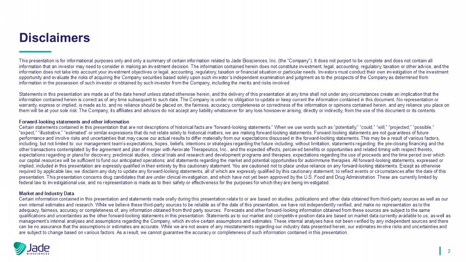 2本演示文稿仅供参考,仅为与Jade Biosciences,I NC相关的某些信息的摘要。(“公司”)。它并不声称是完整的,也不包含投资者在做出投资决定时可能需要考虑的所有信息。此处包含的信息不包含投资、法律、会计、监管、税收或其他建议,并且这些信息没有考虑到您的投资目标或法律、会计、监管、税收或财务状况或特定需求。投资者必须对投资机会进行自己的调查,并仅根据该投资者根据该投资者掌握的信息或该投资者从公司获得的信息确定的对公司前景的独立审查和判断,评估获得公司证券的风险,包括其优点和风险。除非本文另有说明,否则本演示文稿中的陈述自本文件发布之日起作出。在任何情况下,在任何时候交付本prese nta不应造成暗示,在该日期之后的任何时间,本文件所包含的信息是正确的。公司没有义务更新或保持本文件所载的最新信息。不对此处所载信息或意见的公平性、准确性、完整性或COR公正性作出任何明示或暗示的陈述或保证,也不应予以依赖,您对它们的任何依赖将由您自行承担风险。对于因使用本文件或其内容而直接或间接产生的任何损失,本公司、其关联公司和顾问不承担任何责任。前瞻性陈述和其他信息本演示文稿中包含的某些非历史事实描述的陈述属于“前瞻性陈述”。“当我们使用诸如“潜在”、“可能”、“将”、“预计”、“可能”、“预期”、“说明性”、“估计”或类似的表达方式,而这些表达方式并不仅仅涉及历史事件时,我们就是在做出令人费解的陈述。前瞻性陈述不是对未来业绩的保证,涉及风险和不确定性,可能导致我们的实际结果与我们在前瞻性陈述中提出的预期存在重大差异。这可能是多种因素造成的结果,包括但不限于:我们的管理团队对fut ure的期望、希望、信念、意图或战略,包括但不限于以下方面的陈述:收盘前的融资以及与Aerovate Therapeutics, Inc.合并的协议和计划所设想的其他交易,以及与之相关的预期效果s、感知的利益或机会以及相关的时机、关于发现的期望或计划、临床前研究,临床试验和研发计划及时代;关于收益用途的预期以及我们的资本资源将足以为我们的预期运营提供资金的时间段;以及关于自身免疫疗法的市场和潜在机会的声明。本演示文稿中包含的所有前瞻性陈述,无论是明示的还是暗示的,均受到本警示性陈述的明确限定。请注意,不要过分依赖任何前瞻性陈述。除适用法律另有要求外,我们不承担更新任何前瞻性陈述的义务,所有这些陈述均受到本警示性陈述的明确限定,以反映本演示文稿日期之后的事件或情况。这份报告涉及正在接受临床研究的候选药物,这些候选药物尚未成为美国食品和药物管理局的PPR。这些目前受联邦法律限制为调查用途,对于它们被调查的目的的安全性或有效性,不作任何陈述。市场和行业数据本演示文稿中包含的某些信息和在本演示文稿中口头作出的陈述与研究、出版物和从第三方来源获得的其他数据以及我们自己的内部估计和研究有关或基于这些信息。虽然我们认为这些第三方来源截至本呈报日期是可靠的,但我们没有独立核实,也不对以下内容的充分性、公平性、准确性或完整性作出任何陈述, 从第三方来源获得的任何信息。从这些来源获得的预测和其他前瞻性信息受制于与本演示文稿中其他前瞻性陈述相同的资格和不确定性。关于我们的市场和c竞争头寸数据的陈述是基于我们目前可以获得的市场数据,以及管理层关于公司的内部分析和假设,其中涉及某些假设和估计。这些internal分析没有得到任何独立来源的验证,无法保证这些假设或估计是准确的。虽然我们不知道与我们在此提供的数据有关的任何错误陈述,但我们的估计涉及风险和不确定性,并且可能会根据各种因素而发生变化。因此,我们无法保证本演示文稿中包含的此类信息的准确性或完整性。免责声明