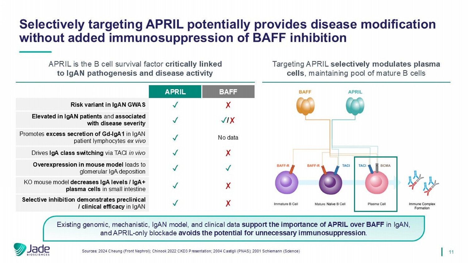 10 APRIL依赖性HSC Pro B细胞大pre-B细胞小pre-B细胞未成熟B细胞成熟Na ï ve B细胞记忆B细胞浆细胞骨髓黏膜黏膜&骨髓CD20表达BAFF依赖性*梯度指示受体表达水平来源:2024 Cheung(Front Nephrol);2023 Mathur(J Clin Med)减少浆细胞产生致病性IgA是一种潜在的疾病-IGAN广泛B细胞耗竭的修饰方法在IGAN中无效……而靶向浆细胞调节非常有效。• B细胞耗竭与利妥昔单抗(抗CD20)未能降低GD-IgA1、抗GD-IgA1自身抗体或蛋白尿,且不影响eGFR。• BAFF中和(blisibimod)并未降低IgA或蛋白尿。• APRIL和双重APRIL/BAFF中和导致GD-IGA1显着和持续消耗,蛋白尿减少,eGFR稳定。APRIL APRIL阻断疗法血浆细胞分化抗体类-切换HIT 1生产半乳糖缺陷型IgA1(GD-IGA1)HIT 2合成抗-GD-IGA1自身抗体HIT 3自身抗体结合GD-IGA1形成致病性免疫复合物HIT 4免疫复合物在系膜中沉积和启动肾损伤中和APRIL消耗GD-IGA1,减少蛋白尿,保存eGFR,在不影响B细胞发育和成熟的情况下提供疾病修饰治疗IgAN。