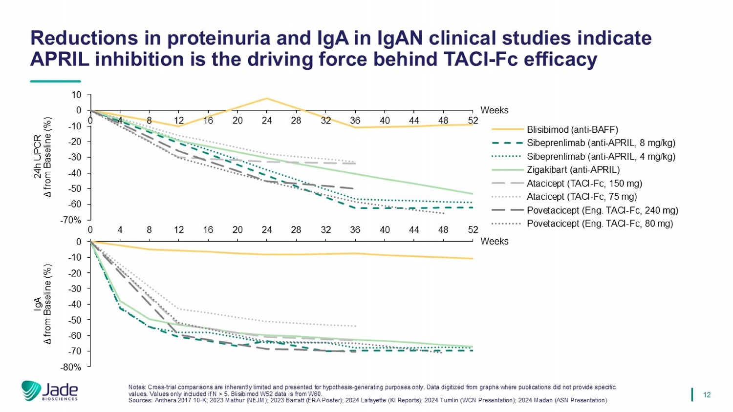 11现有的基因组、机制、IgAN模型和临床数据支持APRIL相对于BAFF在IgAN中的重要性,仅APRIL-阻断可避免不必要的免疫抑制的可能性。选择性靶向APRIL可能提供疾病修饰,而无需增加BAFF抑制的免疫抑制来源:2024 Cheung(Front Nephrol);Chinook 2022 CKD3 Presentation;2004 Castigli(PNAS);2001 Schiemann(Science)BAFF APRIL丨IgAN GWAS中的风险变异丨/丨在IgAN患者中升高并与疾病严重程度相关无数据丨促进IgAN患者淋巴细胞中GD-IGA1的过量分泌离体丨通过TACI在体内驱动IgA类切换丨丨小鼠模型中的过度表达导致肾小球IgA沉积丨KO小鼠模型降低小肠中的IgA水平/IGA +浆细胞丨选择性抑制证明在IgAN APRIL中的临床前/临床疗效是与IGAN发病机制和疾病活动密切相关的B细胞存活因子靶向APRIL选择性调节浆细胞,维持成熟B细胞池