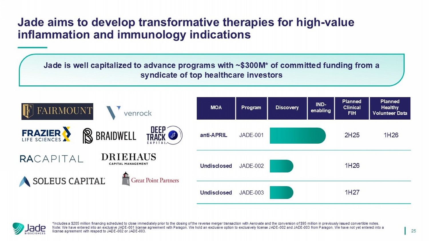 25 Jade旨在开发针对高值炎症和免疫学适应症的转化疗法计划健康志愿者数据计划临床FIHIND-使能发现计划MOA 1H26 2H25 JADE-001 anti-April 1H26 JADE-002未披露1H27 JADE-003未披露*包括一笔2.05亿美元的融资,计划在与Ae Rovate的反向并购交易完成前完成,以及转换先前发行的9500万美元可转换票据。注:我们已与Paragon订立独家JADE-001许可协议。我们持有独家选择权,可独家选择Paragon的lice nse JADE-002和JADE-003。我们尚未就JADE-002或JADE-003订立许可协议。Jade资本充足,可以用约3亿美元推进项目*来自顶级医疗保健投资者辛迪加的承诺资金