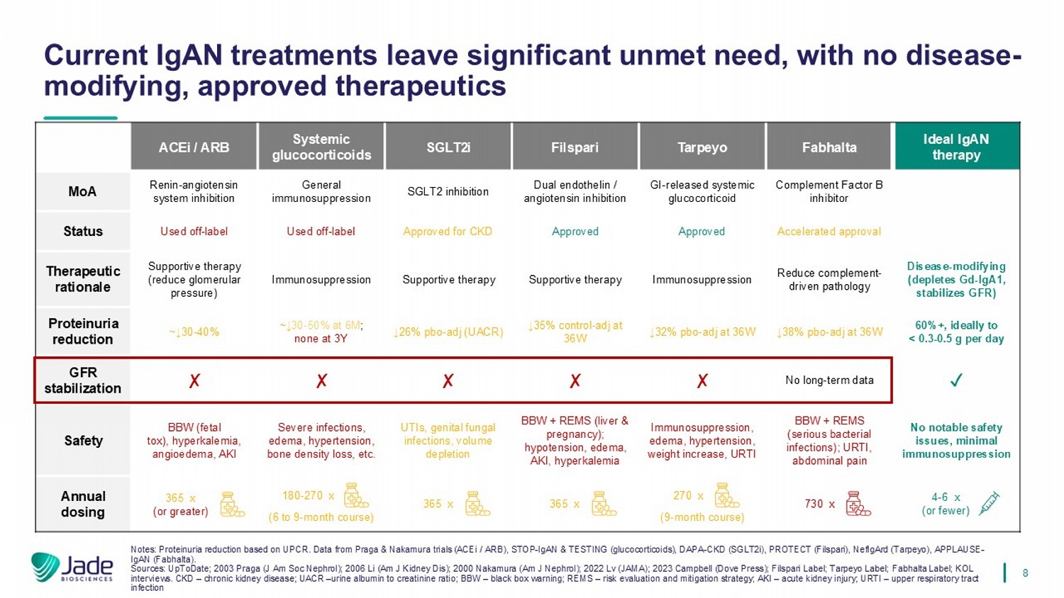 8理想IgAN疗法Fabhalta Tarpeyo Filspari SGLT2i全身性糖皮质激素ACEi/ARB补体因子B抑制剂GI-释放全身性糖皮质激素双重内皮素/血管紧张素抑制SGLT2抑制一般免疫抑制肾素-血管紧张素系统抑制MoA加速批准批准批准批准批准批准批准批准用于CKD使用的脱标使用的脱标状态疾病-修饰(消耗GD-IGA1,稳定GFR)减少补体驱动的病理免疫抑制支持疗法支持疗法免疫抑制支持疗法(降低肾小球压)治疗原理60% +,最好每天< 0.3-0.5 g ↓ 38% pbo-adj at 36W ↓ 32% pbo-adj at 36W ↓ 35%对照-adj at 36W ↓ 26% pbo-adj(UACR)~↓ 30-50 % at 6m;3Y时无~↓ 30-40 %蛋白尿减少丨无长期数据GFR稳定无显着安全性问题,免疫抑制极小BBW + REMS(严重细菌感染);URTI、腹痛免疫抑制、水肿、高血压、体重增加、URTI丨BBW丨+ REMS(肝脏&妊娠);低血压、水肿、AKI、高钾血症UTI、生殖器真菌感染、容量耗竭严重感染,水肿、高血压、骨密度下降等。BBW(胎儿TOX)、高钾血症、血管性水肿、AKI安全性(9个月疗程)(6至9个月疗程)年度给药注意事项:基于UPCR的蛋白尿减少。数据来自Praga & Nakamura试验(ACEi/ARB)、STOP-IgAN & Testing(糖皮质激素)、DAPA-CKD(SGLT2i)、ProtECT(Filspari)、NeFIGArd(Tarpeyo)、AppLAUSe-IgAN(Fabhalta)。资料来源:UpToDate;2003 Praga(J Am SOC Nephrol);2006 Li(Am J Kidney DIS);2000 Nakamura(Am J Nephrol);2022 LV(JAMA);2023 Campbell(Dove Press);Filspari Label;Tarpeyo Label;Fabhalta Label;KOL采访。CKD –慢性肾病;UACR –尿白蛋白与肌酐比率;BBW –黑框警告;REMS –风险评估和缓解策略;AKI –急性肾损伤;URTI –上呼吸道感染当前的IGAN治疗留下显着未满足的需求,没有疾病修饰,批准的疗法180-270 x 4-6 x(或更少)365 x(或更多)365 x 365 x 730 x 270 x