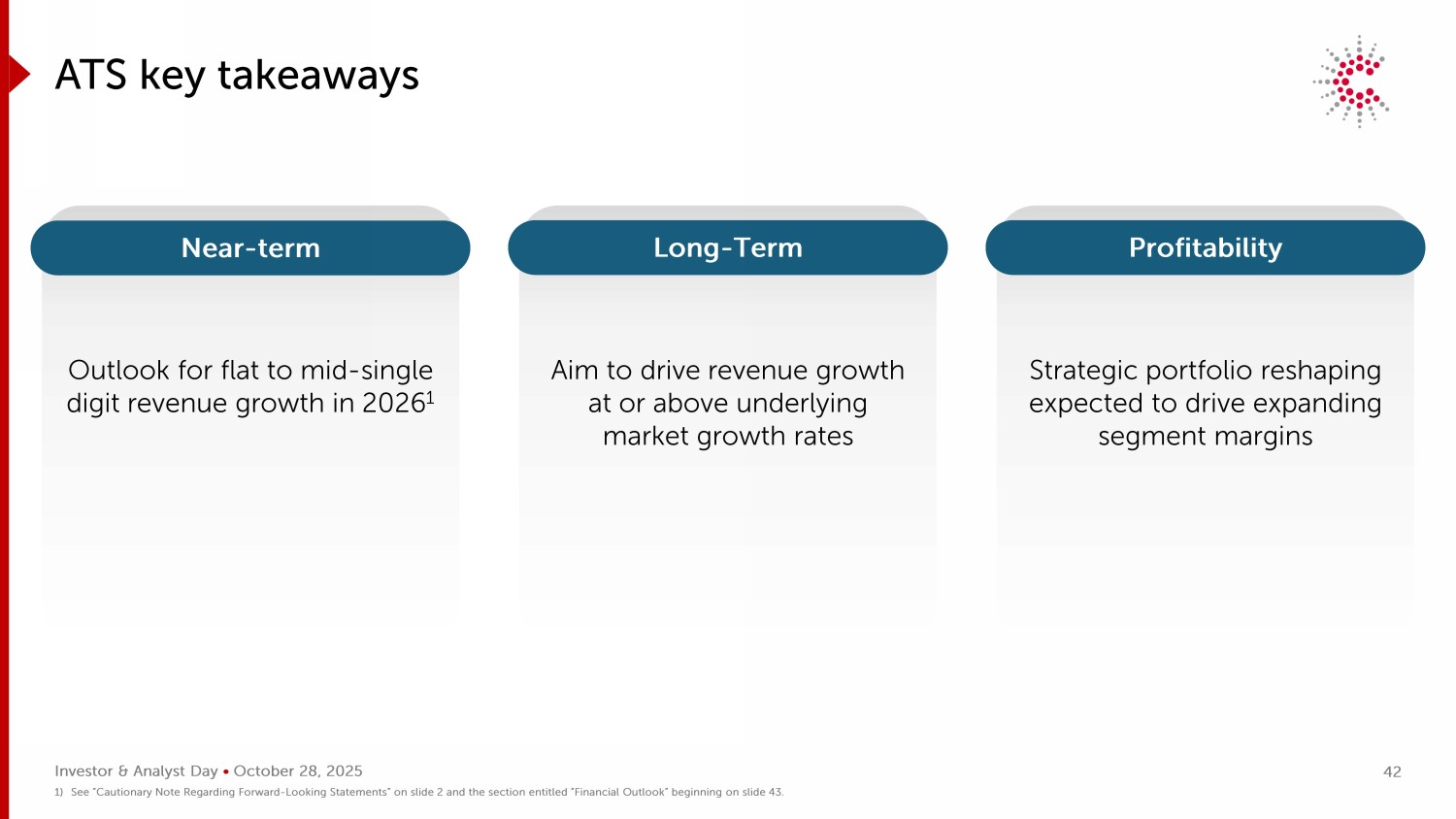 Investor & Analyst Day • 2025年10月28日战略投资组合重塑预计将推动分部利润率扩大旨在推动收入增长达到或高于基础市场增长率展望2026年收入增长持平至中个位数1 ATS关键要点近期长期盈利能力1)请参阅幻灯片2上的“关于前瞻性陈述的注意事项”和幻灯片43开始的标题为“财务展望”的部分。42